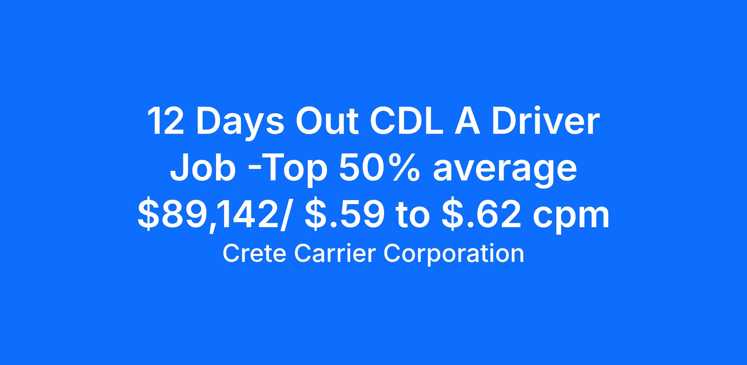 Crete Carrier offers a 12 Days Out. 1 Day Home for Every 6 Days.Salary: Top 50% average $89,142 per yearCPM: Starting pay $.59 to $.62 cpmExperience: One-year verifiable tractor trailer experience with a class A CDL