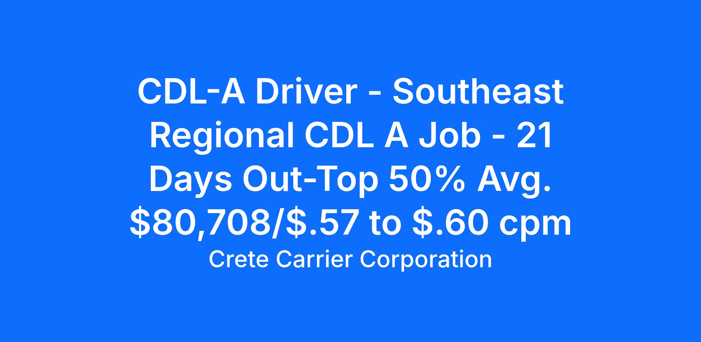 Crete Carrier offers a 21-Day Out Southeast Regional.Salary: Top 50% average $80,708 per yearCPM: Starting pay $.57 to $.60 cpmExperience: One-year verifiable tractor trailer experience with a class A CDL