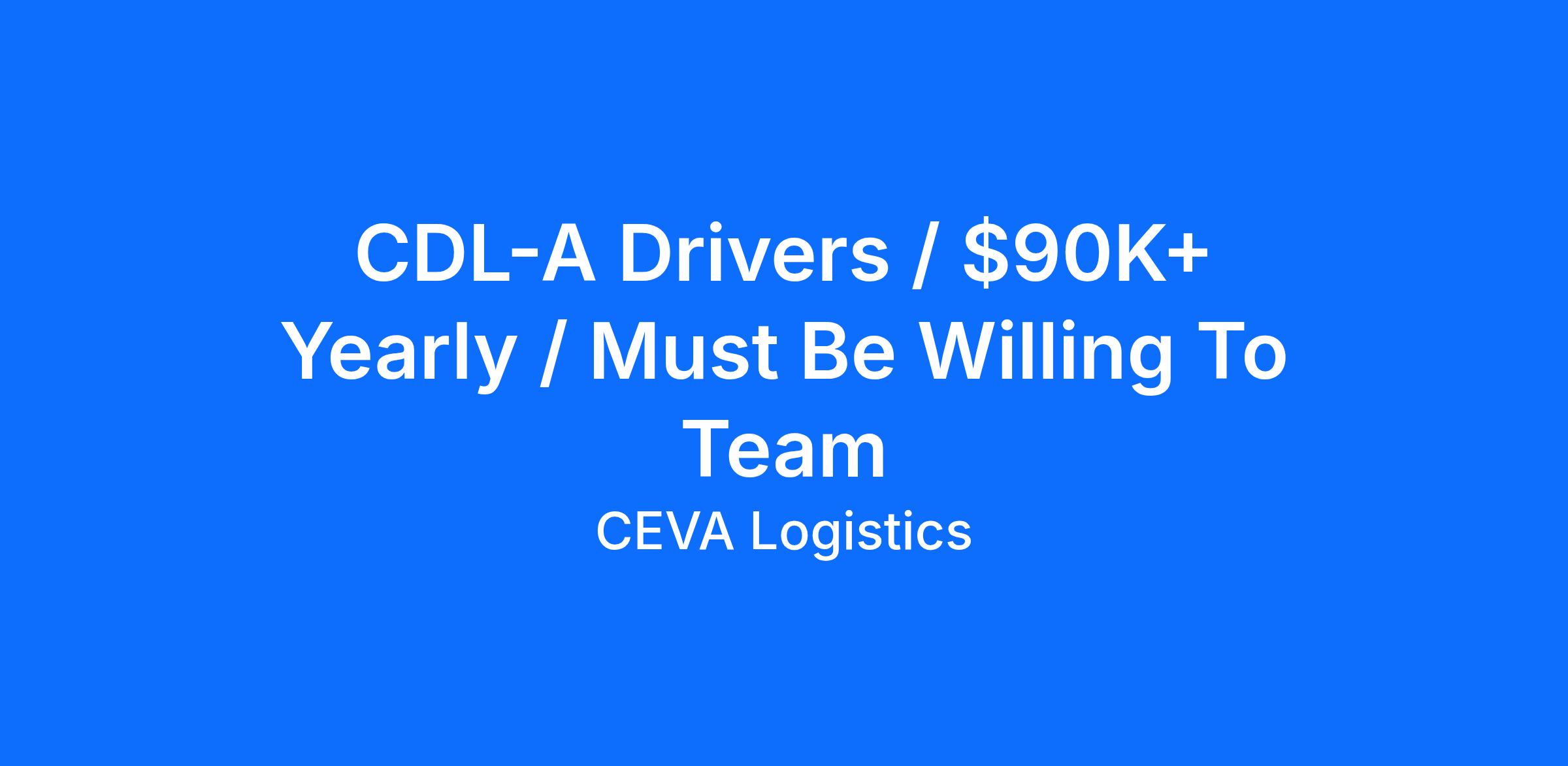 CEVA Logistics is Hiring CDL A Company Drivers in Portland, OR We Have the Benefits You Need:Drivers gross $90,000+ yearlyRoute pay:$353 per driver$45 per diem per driver$2,500 sign-on bonusHome on weekends (regional routes)Driver referral bonus:$1,000 per driver hiredPaid after 90 days of employmentQuarterly safe driving bonusPaid via weekly direct depositOutstanding benefits starting 1st day of the following month after your date of hire if enrolled within 45 daysCEVA pays 70% of the cost of single medical benefits coverage!401k with company match100% on the first 3P% on the next 2%Eligible after 90 days of hire15 PTO days in January after year of hireProrated 1st year8 paid company holidaysPlus 1 floating holidayTuition/education assistanceUp to $5,200 toward an undergraduate degreeUp to $8,000 toward a post-graduate degreeWith approval after 1 year of full-time employmentPaid orientationCompany-provided safety equipment Other Perks/Discount Programs:Employee discount portal with deals on:TravelTicketsAutoHealthWellnessFoodAnd more! Company Driver Requirements:Valid CDL AAt least 6 months of verifiable CDL A driving experienceDoubles endorsement and experience are requiredMust be willing to team or already established as a team driverMust be at least 21 years of age or olderMust have a high school diploma or GEDAt least 5 years of industry driving experience may be substituted for a high school diploma or GEDClean motor vehicle record (MVR) in the last 3 yearsNo more than 3 moving violations/traffic citations in the past 3 yearsNo more than 2 preventable accidents (chargeable or not) in the last 3 yearsMust meet Department of Transportation (DOT) testing and physical requirements and be knowledgeable of DOT regulationsMust be able to pass a required pre-employment drug screenMust be able to read, write, and speak EnglishDrivers must live within 45 miles of Portland, OR, or be willing to relocate for this position About Ceva LogisticsCEVA Logistics is an industry leader providing supply chain management solutions and exceptional service to large and medium-sized national and multi-national companies. With a genuine culture of recognition, we want our employees to grow, develop, and be part of our journey. We are a team in every sense, and we support each other and work collaboratively to achieve our goals together. With multiple divisions, we have opportunities for every driver. So, whether you're looking for local, dedicated, or OTR routes, we have the miles and benefits you need. Join our team today! CEVA Logistics is proud to be an equal opportunity workplace and an affirmative action employer. All qualified applicants will receive consideration for employment without regard to race, color, religion, gender, gender identity or expression, sexual orientation, national origin, genetics, disability, age, veteran status, or any other characteristic. We are an Equal Opportunity Employer of Minorities, Females, Protected Veterans, and Individuals with Disabilities.