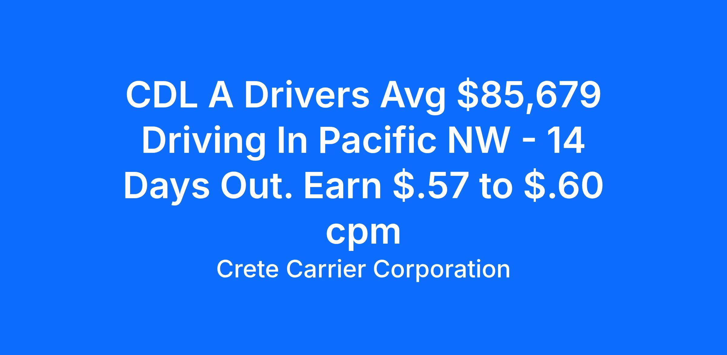 Crete Carrier offers a Regional Pacific NW for CDL A Drivers.Salary: $85,679CPM: Starting pay $.57 to $60 CPMExperience: One-year verifiable tractor trailer experience with a class A CDL WHY CHOOSE CRETE CARRIER?At Crete Carrier and Shaffer Trucking, our miles are up significantly. In fact, we need more safe, experienced drivers to meet the needs of our customers. Crete, Shaffer, and Hunt drivers are paid based on practical miles. This means drivers are paid for 3-5 percent more total miles per year than companies that pay based on short route miles. Another added incentive is that those practical miles roll in faster now that we've recently raised our governed truck speed to 68 MPH on the cruise and 65 MPH on the pedal. The most productive 50 percent of our Crete Carrier and Shaffer Trucking OTR drivers average more than $96,542 annually. That equates to over $1,856 weekly; $.61 to $.64 CPM. The top 50% of our Hunt Transportation drivers average $93,347 annually ($1,795 per week), with starting pay ranging from $0.61 to $0.68 per mile. We also offer comprehensive and affordable health insurance, matching 401k and a profit-sharing plan that contributed $11 million in 2024 and more than $91.5 million to employee retirement accounts since 2018. AT CRETE, SHAFFER, AND HUNT, INDUSTRY LEADING PAY IS JUST THE BEGINNING WHAT IS LEADING PAY PLUS?Leading Pay Plus includes the industry leading pay that Crete Carrier Corporation is known for plus the extras which add more to a driver's bottom line, improve a driver's quality of life, and help a driver succeed in their profession. Take a few minutes to see how our Leading Pay Plus program stacks up against your current situation. We believe you'll choose Crete Carrier and Shaffer Trucking. About Crete CarrierOver the past 50 years, Crete Carrier has grown to one of the nation's largest, privately owned trucking companies. Along with sister company, Shaffer Trucking, and wholly-owned subsidiary Hunt Transportation, Crete Carrier Corporation operates as a truckload and flatbed carrier for virtually any commodity. Our drivers are among the best, exceeding the CSA score standards required by the U.S. Department of Transportation. Crete Carrier is a Leading Pay Plus Carrier with industry-leading benefits that include health insurance from BCBS of Nebraska, dental, vision, life, 401K, and a profit-sharing program. Because of this, drivers typically stay with us three times longer than the competition. *Some area restrictions apply.