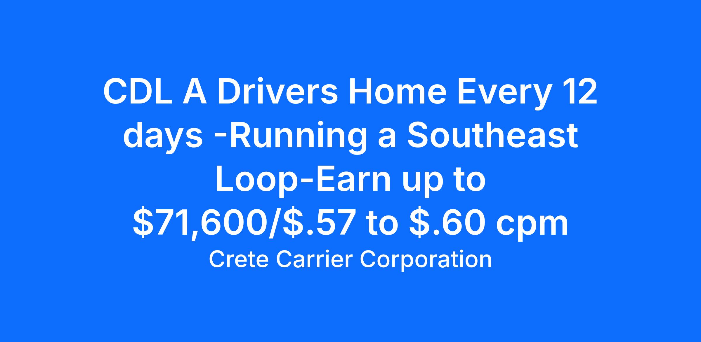 Crete Carrier offers home time every 12 days with a Southeast Regional.Salary: Top 50% average $71,600 per yearCPM: Starting pay $.57 to $.60 cpmExperience: One-year verifiable tractor trailer experience with a class A CDL