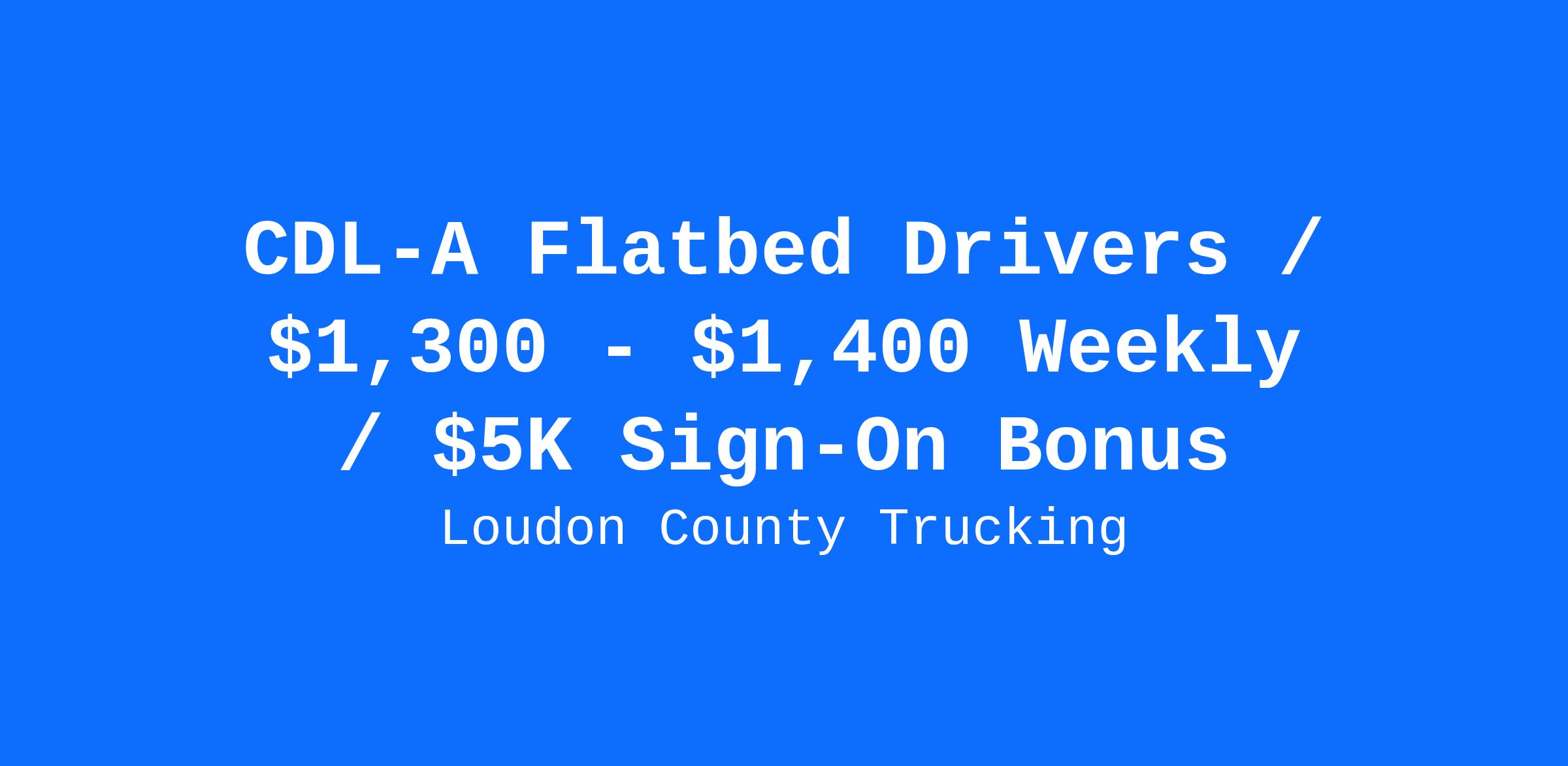 Loudon County Trucking has been Providing the Highest Quality Driving Jobs for 22 YearsOur drivers are our #1 asset and their job satisfaction is our top concern! You will be glad you chose to drive for LCT. Just announced day 1 lease purchase available! Benefits: 27% of Load RevenueEarning 27% of load revenue means that when freight goes up, your compensation goes up with it. Drivers average at or above $1,400 per week.$5,000 Sign-On BonusReceive $1,500 after the 1st load!$3,000 Driver Referral Bonus.Rider & Pet PolicyStrong MilesOur freight is steady, meaning your miles are as well.Benefits PackageMajor medical, dental, vision, and life insurance after 30 days. 401k and paid vacation.Top EquipmentLate-model trucks mean fewer breakdowns.Conestoga trailers...Great flatbed freight without the tarps.Tech ResourcesEmail settlements. ADP online for viewing pay and weekly direct deposit.Lease PurchaseTop drivers can make the choice to join our LP program. Requirements: Must be 22 years of age. Must have a valid Class A CDLMinimum one-year tractor-trailer with at least six months flatbed experience*Loudon County Trucking does offer flatbed training to drivers with one year of OTR experience with little to no flatbed experience. About Loudon County Trucking:Why Drive Flatbed with Loudon County Trucking?We do OTR right! That means safety and driver satisfaction come first. We will not be satisfied until you are! Our goal is for you to get all the miles you want and the home time that you need. We will put your needs first, starting right away with paid orientation! But we will not stop there. We will consult with you to develop a working plan that is the right choice for you. You will have access to a variety of freight and destinations, quality maintenance support, and professional, friendly dispatch 24 hours a day and 7 days a week. We maintain an open-door policy that allows drivers to meet face-to-face with dispatch and with management.Why Our Drivers Stay!Many of our drivers have been here for over 10 years, and you'll find plenty who have been with us going on 20 years. We earn driver loyalty by giving you the respect that you deserve for the difficult job you do and by treating you as an individual and not a truck number. Our drivers average 2,500 miles a week and still get quality home time. With 27% load revenue, your pay reflects the work you do. You can make the choice today to come to a company where you will want to stay!