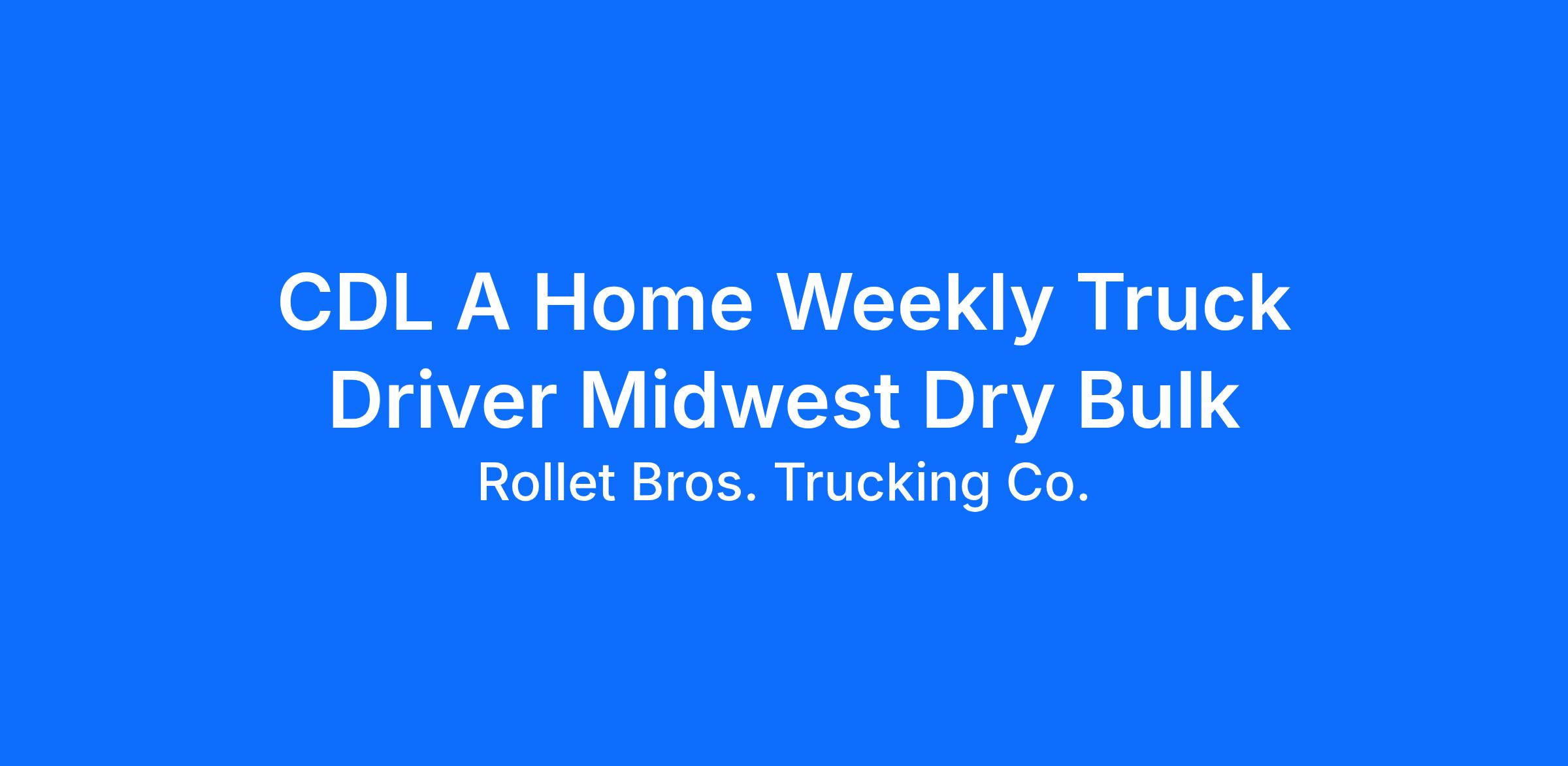 $1,700-$1,900 weekly avg - Home weekly - Hub Miles PaidHub miles paid - when the wheels are turnin' you're earnin' top pay! Drivers average $1,700-$1,900 weekly All hub miles paid - get paid for EVERY mile! Home weekly, resets at home! Dry Bulk freight End Dump, Hopper, Pneumatic trailers Manual and Automatic transmission trucks available Rollet Bros is a Family owned and operated company, We deliver dry bulk freight throughout the Midwest. Based out of Perryville Missouri with over 60 plus years of experience. Drivers are home weekly. Pay every Friday Direct Deposit. Drivers are paid based on Hub Miles as the wheels turn.Easily attainable bonuses! Predictable home time! Every week! 2 cent per mile raise after 6 months 6 PAID holidays after 90 days Paid vacation after 6 months Medical, Dental, Vision and 401k with match benefits available! Our steady scheduling, competitive pay, limited delivery area, and growth explains the low turnover rate we enjoy! So, if you are tired of the East Coast and/or West Coast, tired of being away from family more than a week, tired of waiting for back hauls, tired of empty promises€¦€¦. Then please consider our company in your search for that new job! Call Ben at with an explanation of our lanes.Come grow with us!Wage Range: 1300.00 - 1900.00 per week General Description of Benefits: medical, dental, 401k with employer match, paid holidays, vacation starting after 6 months etc Class A License Manual transmission experience preferred, automatics available