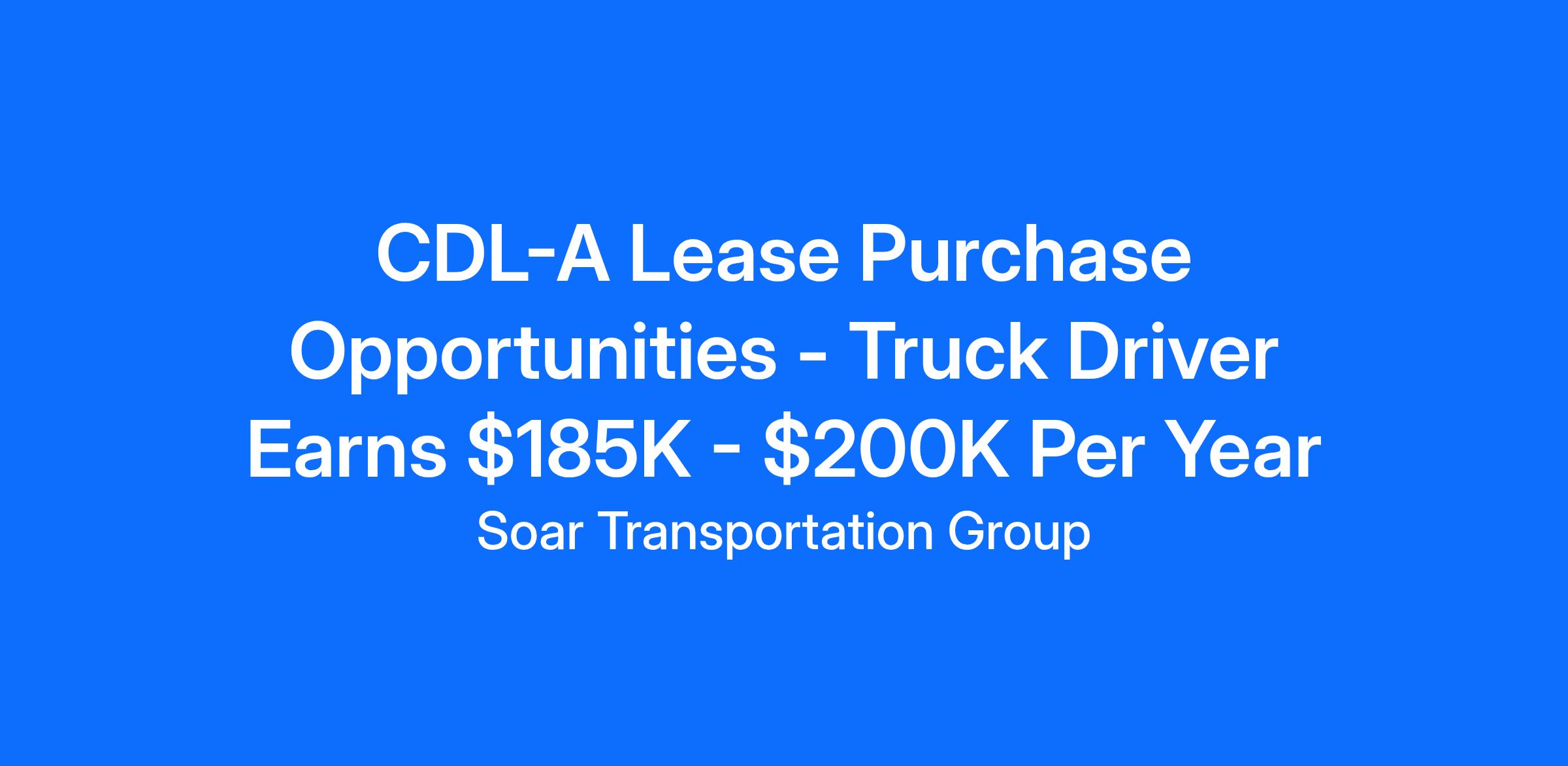 Take Flight In Your New TruckYou'll fly high indeed with an average $200,000-$215,000 per year, a pay increase that puts the driving business of your dreams closer than ever. In addition to outstanding pay, our lease-purchase program also offers the support every new truck owner needs to succeed. Seize the dream of driving independence and take flight in your new truck today with SOAR. CDL-A Lease Purchase Experienced Truck Drivers