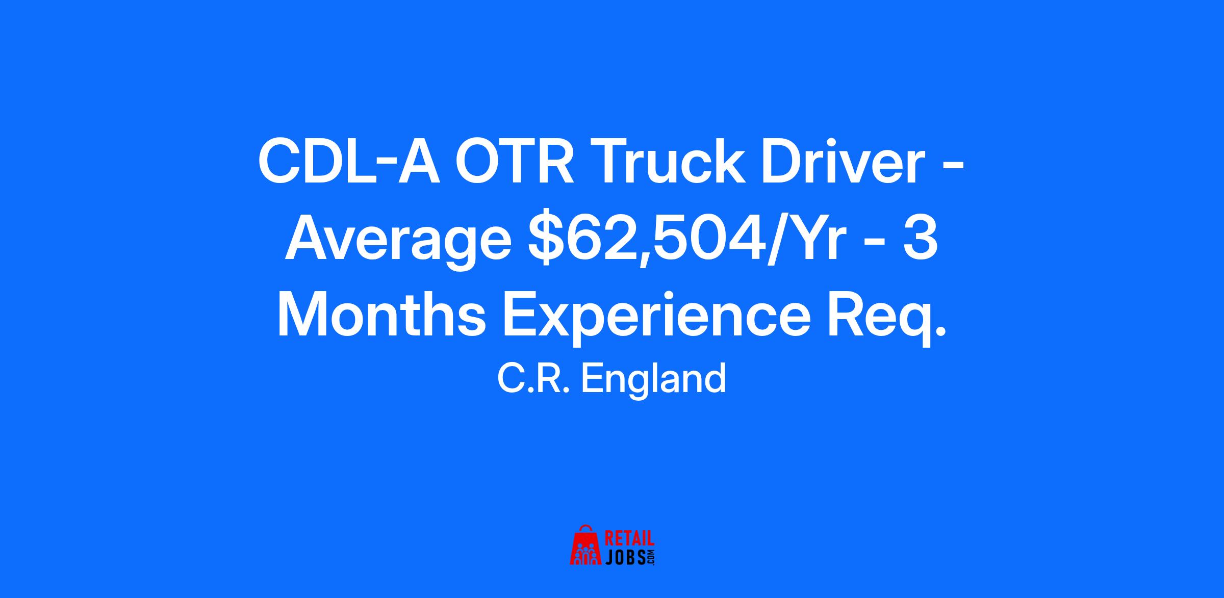 C.R. England is Now Hiring CDL-A OTR Drivers! Drivers Average $62,504 Annually A valid CDL-A and 3 months of current experience are required This lane is not suitable for students, recent grads, or trainees This OTR Route Offers: Drivers average $62,504 annually - Top 10% earn up to $78,624 per year Average $1,202-$1,512 weekly Home time: 2-3 weeks out with 2-3 days off No-touch freight CPM Safe & on-time bonus Top-of-the-line automatic transmission trucks Benefits Include: Full benefits package for you and your family 401k participation Paid time off & bonus incentives Unlimited cash referral program Route Details: This OTR position provides a great opportunity to travel across the country while earning competitive paychecks driving a C.R. England truck Delivery locations and haul lengths vary based on your place of residence, but some fleets offer set run tours for more frequent home time C.R. England is committed to safety, with top-of-the-line Freightliner trucks that are three years old or newer and equipped with the latest safety features Drivers handle no-touch freight, which primarily consists of refrigerated goods along with some dry freight Your success in this role will depend on your strong work ethic and effective communication with both customers and fleet managers We are looking for dependable drivers to join our team! If you have what it takes to service our customers with the highest degree of customer service and integrity, we want to speak with you. Requirements: A valid CDL-A and 3 months of current experience are required This lane is not suitable for students, recent grads, or trainees Must be 21 years or older Must be able to pass a DOT drug screen Better Pay, Home Time, and Miles - Apply Now! STEP ONE: Start by submitting this short form STEP TWO: On the next page, complete a 2-minute C.R. England online application STEP THREE: We will contact you at the number provided to connect you with a dedicated account specialist Explore the Open Road with C.R. England - Apply Now! Pay Disclaimer: The job information and data provided here are for informational purposes only, are based in whole or in part on estimates, and do not represent any type of promise or prediction of future performance or employment. PAST PERFORMANCE AND THE INFORMATION CONTAINED HERE ARE NO GUARANTEE OF FUTURE PAY RESULTS, REVENUE, MILES, OR HOME TIME. NO RIGHT TO EMPLOYMENT, CONTINUED EMPLOYMENT, SPECIFIC EMPLOYMENT, OR A MINIMUM AMOUNT OF MILES OR HOME TIME, OR SPECIFIC PAY AMOUNT IS GUARANTEED OR CREATED BY THIS DATA OR THE USE OF THIS SITE. ANY AMOUNTS IN ANY CATEGORIES ON THIS SITE WILL NOT REFLECT ACTUAL FUTURE RESULTS. Your actual pay, mileage, and home time will vary from these numbers depending on many factors, which may include tenure-based pay rates, your fleet, how hard you work, company performance, and how much you drive, among other factors. Because precise rate of pay can be difficult to guarantee in various pay structures common in the transportation industry, you are only guaranteed applicable minimum wage for hours worked in a given pay period. Click here for additional disclaimer information and additional detail about how this data is generated.