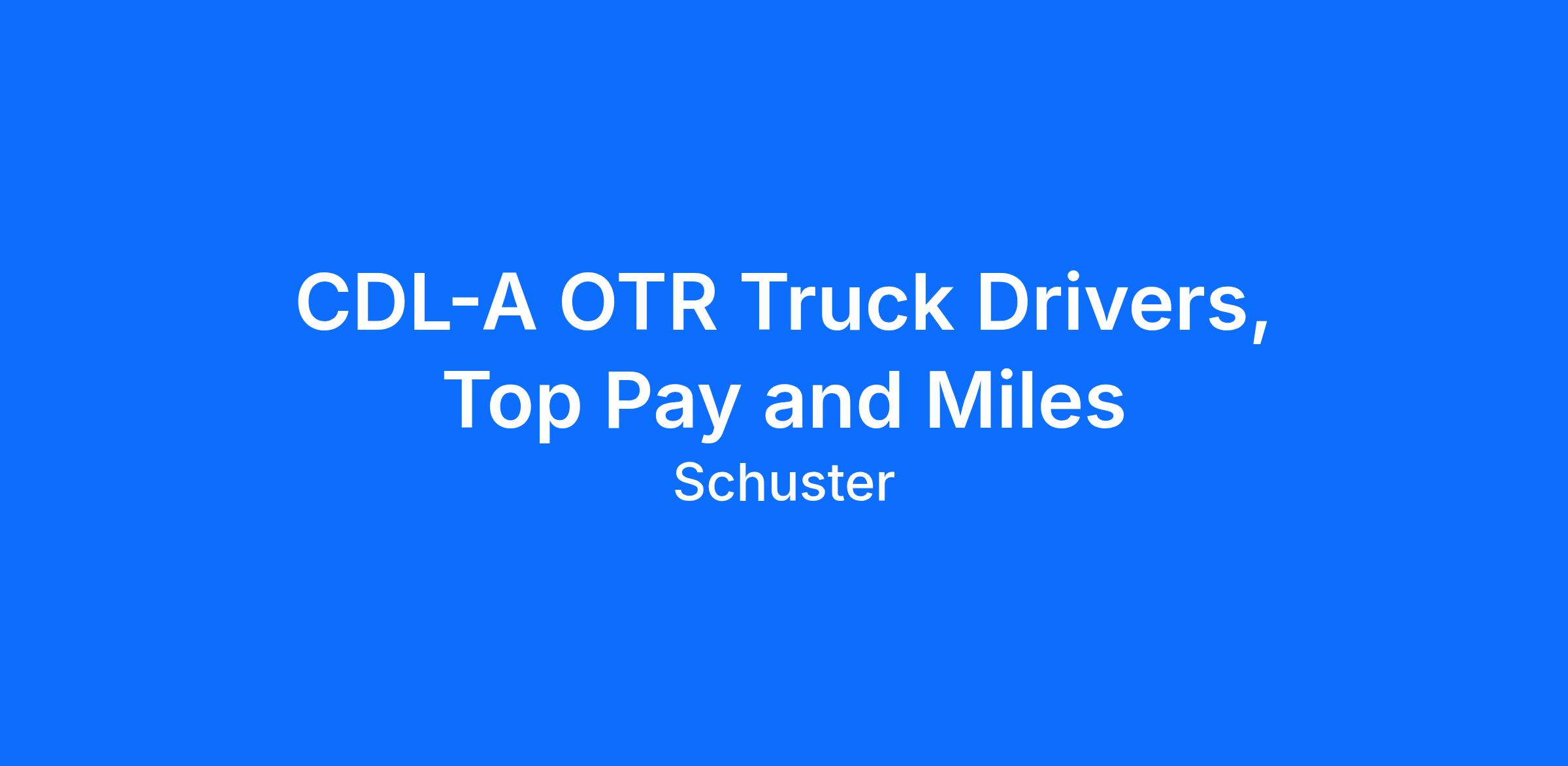 CDL-A OTR Truck Driver Jobs Open Now! Apply today or call to learn more. 844-###-####With 60 years of success behind us, Schuster is looking ahead to even more outstanding opportunities for CDL-A over-the-road truck drivers hauling refrigerated freight such as meat and ice cream. Join Schuster and enjoy a support system that treats you like family and prioritizes you as a professional.! CDL-A OTR Truck Drivers Enjoy: Pay is between $85,000 - $90,000 per year .02 CPM increase after 90 days 2,000 2,500 weekly miles Run all 48 lower states typically 14-17 days out, home 2 varies based on location 50/50 drop and hook/live load and unload Paid Orientation & $1,500 Referral Bonus $50 East coast pay $40 per billable stop charge Veteran recognition Pet & rider friendly! Health, dental, vision, & life insurance Wellness program 401(k) with company contribution Open Door Policy Requirements: Valid Class A CDL 21 years of age 1 year of recent tractor-trailer experience No more than 1 violation in the last 3 years (with no serious violations, suspensions, or DUIs within the last 5 years) No more than 3 previous driving jobs in the last year Pass DOT Physical, Drug and Medical Join the Schuster family today! APPLY NOW or CALL 844-###-####