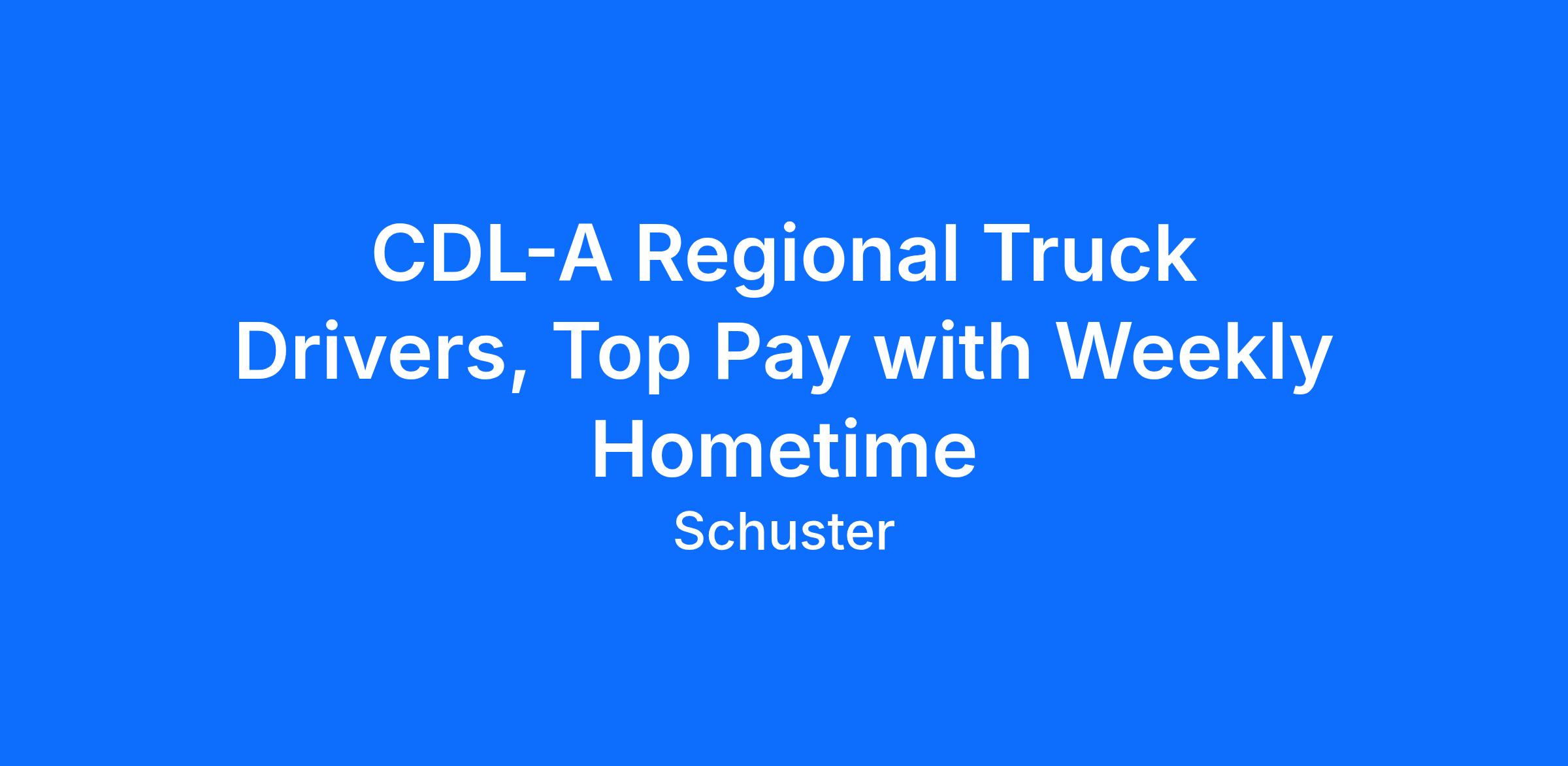 CDL-A Regional Truck Driver Jobs Open Now! Apply today or call to learn more. 844-###-#### With 60 years of success behind us, Schuster is looking ahead to even more outstanding opportunities for CDL-A truck drivers on OTR routes and limited regional runs hauling refrigerated freight such as meat and ice cream. Join Schuster and enjoy a support system that treats you like family and prioritizes you as a professional. Learn more and apply today or call 844-###-####! CDL-A Regional Truck Drivers Enjoy: Pay is between $70,000-$75,000 per year Weekly home time 1,800-2,000 miles per week depending on your location $1,500 referral bonus Paid Orientation Health, dental, vision, and life insurance 401(k) with company contribution Paid time off Pet & rider programs available Veteran recognition Wellness program Open Door Policy Reg. running area: IA, MN, WI, IL, IN, MI, MO, KS, NE, with limited parts of WY, CO, and OH Requirements: Valid Class A CDL 21 years of age 1 year of recent tractor-trailer experience No more than 1 violation in the last 3 years (with no serious violations, suspensions, or DUIs within the last 5 years) No more than 3 previous driving jobs in the last year Pass DOT Physical, Drug and Medical Join the Schuster family today! APPLY NOW or CALL 844-###-####