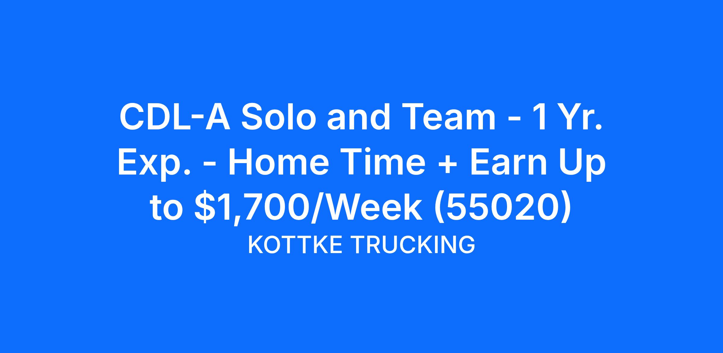 CDL-A Solo and Team - 1 Yr. Exp. - Home Time + Earn Up to $1,700/Week (55020)