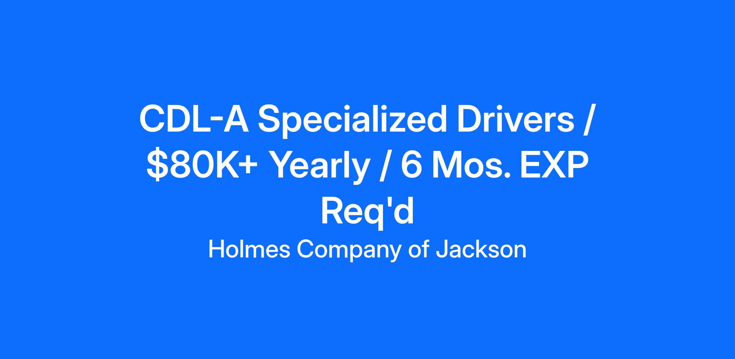 HIRING SPECIALIZED AND FLATBED COMPANY DRIVERSTop Drivers Can Earn $80K+ a Yearand Get Home Weekly!Benefits:Average weekly pay range of $1,200 - $1,700Weekly home timeBonus checks twice a year!Orientation pay with hotel and transportation accommodationsEFS fuel cardPre-Pass/Best Pass deviceReferral bonus programVacation payFREE-to-you passenger programGroup insurance includes: medical, dental, vision, and life insurance (family plans available)Retirement plans: 401k, RothCompany matched dollar for dollar up to 3%, and then 0.50 per dollar up to 6%Requirements:At least 6 months of driving experienceValid Class A CDLAbility to pass a drug testClean MVR for the last 3 yearsAbility to pass DOT physical About Holmes Company of Jackson Inc:Holmes Company started in 1981 with one truck. Today the fleet consists of 100 power units operating throughout the 48 states, meeting the needs of the customers. We offer long-haul, regional, and Logistics Services to our customers, allowing us the opportunity to meet any need they may have. To accomplish this, we hire only the “BEST” experienced and qualified drivers in the marketplace. We have one of the lowest turnover rates in the industry. Along with the trucking experience in our organization, we contribute our success to hard work and dedication to our people and our customers. Our people are our greatest asset. —The Holmes Company IS OUR PEOPLE.