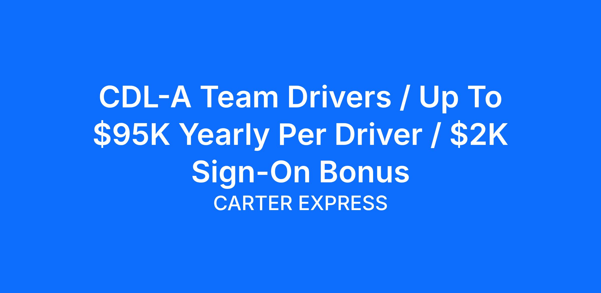 Carter Express has a Job for Every DriverHiring Company Drivers - Home Weekly Dedicated Regional Runs CDL A Solo Truck Driver Benefits:Regional Driver Pay:$63,000 - $75,000 average per year (based on experience and location)$.50 CPM - $.58 CPM (based on experience and location)$1,400 weekly minimumHome-Daily Driver Pay (Chattanooga, TN location only):$1,150 - $1,200 average per week (based on experience)$22.50 - $26.00 per hour (based on experience)$1,000 sign-on bonusOther bonus programs available (performance, fuel, idle and driver referrals) CDL A Team Truck Driver Benefits:Earn up to $95,000+ per driverPay Range: $.73 CPM - $.79 CPM (based on experience)Mileage minimum: 5,000 miles per week$2,000 sign-on bonus per team ($1,000 per driver)Teams can earn up to 3 weeks of paid vacation per yearConsistent, weekly home timeQuarterly bonus programs available (Safety, Performance, Fuel, Idle and Referral)Teams receive the newest trucks in the fleet Driver Benefits at Carter ExpressREGIONAL runs with WEEKLY HOMETIMESupportive culture, low turnoverCompetitive pay with no-touch freightHigh-quality trucks & equipmentGreat maintenance programStable and safety-oriented companyHealth, dental, vision, & life insurance availableFree Teladoc medical carePaid vacation & holidaysPaid orientationTop-to-bottom support for driversFamily focus ? annual family picnics, awards banquets, community outreach & more Carter Express Driver Requirements:CDL-A Experience Needed12 months of CDL-A experience for Solo Positions6 months of CDL-A experience for Team PositionsAcceptable MVRMust be 21 or older About Us:No one puts more time and care into their driving force than Carter Express! With a wide variety of CDL A driving opportunities, Carter Express is where the best CDL A truck drivers want to be because of our supportive culture, steady freight, and safety focus.