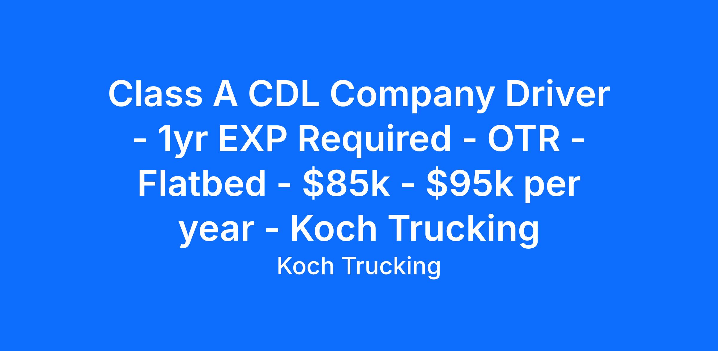 Job Description: Koch Trucking is looking to hire CDL-A truck drivers to join our flatbed division. Our flatbed fleet allows you to maximize your earning potential by providing consistent, steady miles hauling oversized flatbed loads. No flatbed experience? No problem, we provide additional training during orientation to ensure you are capable and confident before hitting the road. All candidates must have a valid CDL-A license. Apply online.
