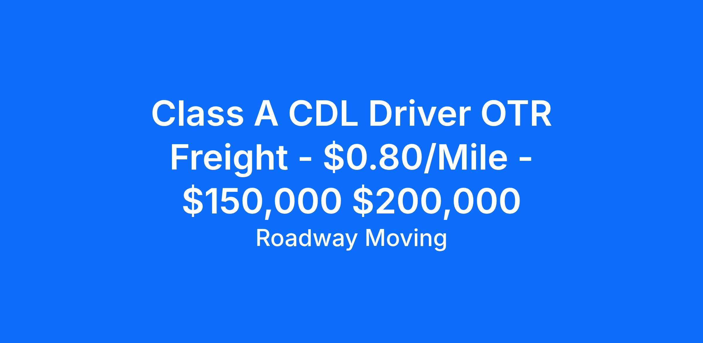 Class A CDL Driver OTR Freight - $0.80/Mile - $150,000 $200,000+ About the Company: Founded in 2008 by Ross Sapir, Roadway Moving is built on the core principles of accountability, kindness, generosity, and dedication. These values drive a culture of excellence, where our people not just our trucks set us apart in a crowded industry. We believe in investing in both our employees and our clients, fostering an environment rooted in respect, urgency, clear communication, and appreciation. At Roadway, we don t just move boxes, we move lives, and we do it with a commitment to making the experience remarkable for everyone involved.