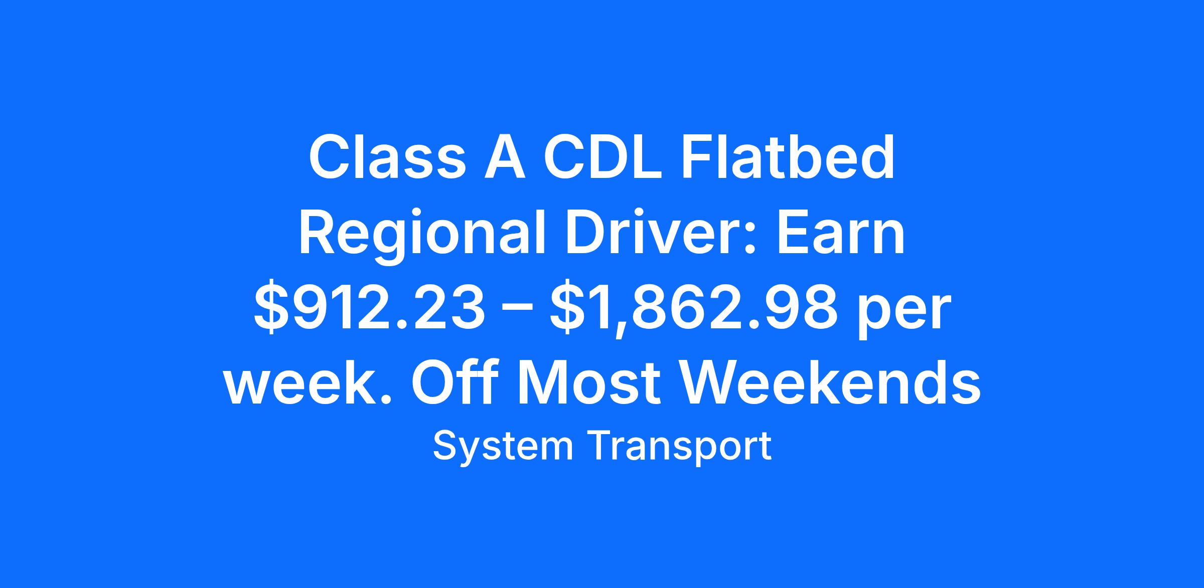 Class A CDL Flatbed Regional Driver: Earn $912.23 – $1,862.98 per week. Off Most Weekends