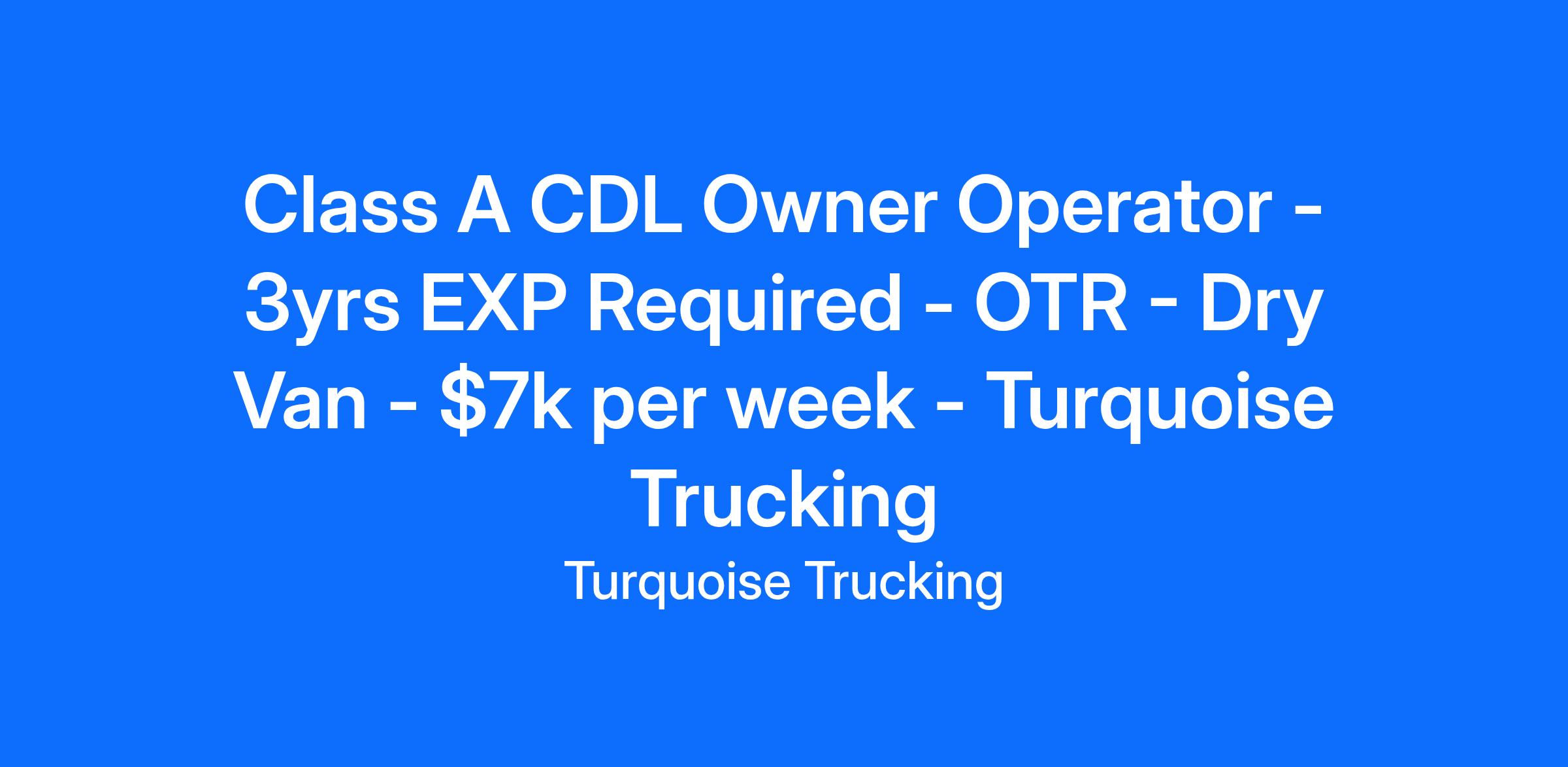 Class A CDL Owner Operator - 3yrs EXP Required - OTR - Dry Van - $7k per week - Turquoise Trucking