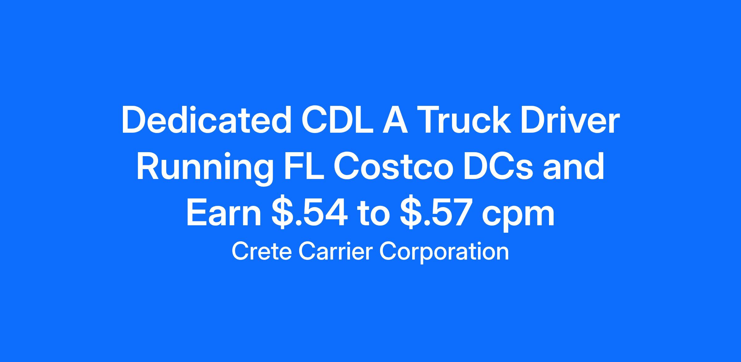 Crete Carrier offers CDL A Drivers a Dedicated Route in FLSalary: $63,211 to $68,654CPM: Starting pay $.54 to $57 CPMExperience: One-year verifiable tractor trailer experience with a class A CDL