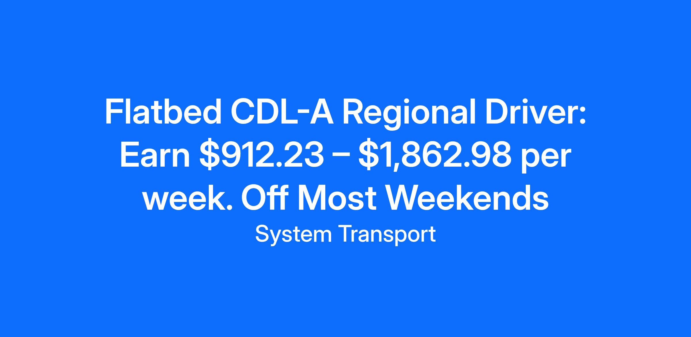 CDL A Regional Flatbed Driver: $912.23 – $1,862.98 per week. Most Weekends off!AMERICA PROUD. FLATBED STRONG. DRIVE SYSTEM TRANSPORT!Looking for an exciting driving opportunity in the western region of America? System Transport is hiring experienced CDL-A flatbed truck drivers for regional and OTR routes. As a driver, you will be transporting important goods and materials such as glass, steel, aluminum, building materials, machinery, coils, and specialty metals. We offer competitive pay packages and excellent benefits. Join our team and become America Proud, Flatbed Strong with System Transport. Don't wait, apply now!