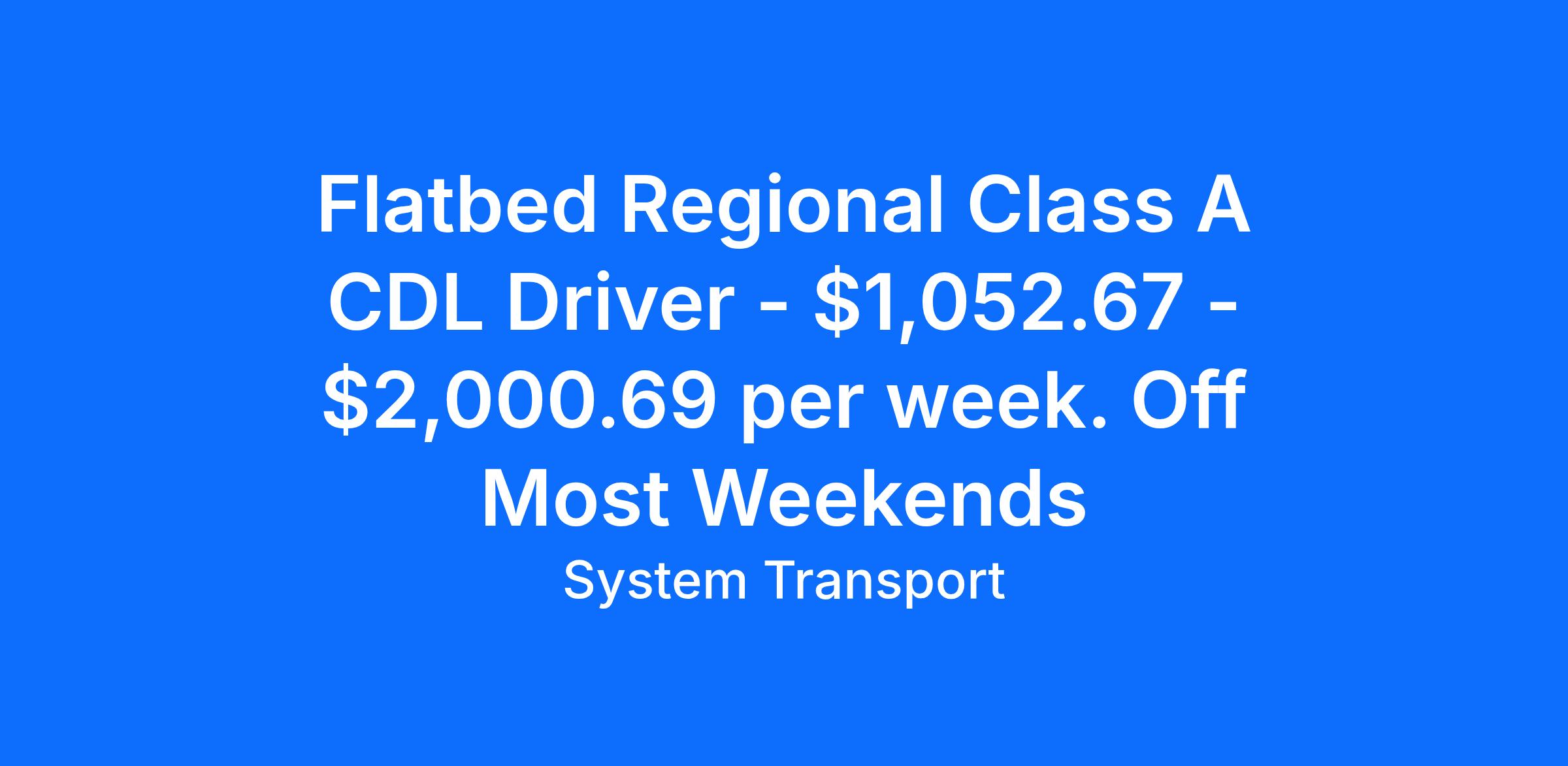 Flatbed CDL A Driver, Regional Route: $1,052.67 - $2,000.69 per week. Off Most WeekendsLooking for an exciting driving opportunity in the western region of America? System Transport is hiring experienced CDL-A flatbed truck drivers for their regional division 295. As a driver, you will be transporting important goods and materials such as glass, steel, aluminum, building materials, machinery, coils, and specialty metals. We offer competitive pay packages and excellent benefits. Join our team and become America Proud, Flatbed Strong with System Transport. Don't wait, this offer is limited - apply now! OPPORTUNITY FOR CDL-A FLATBED TRUCK DRIVER