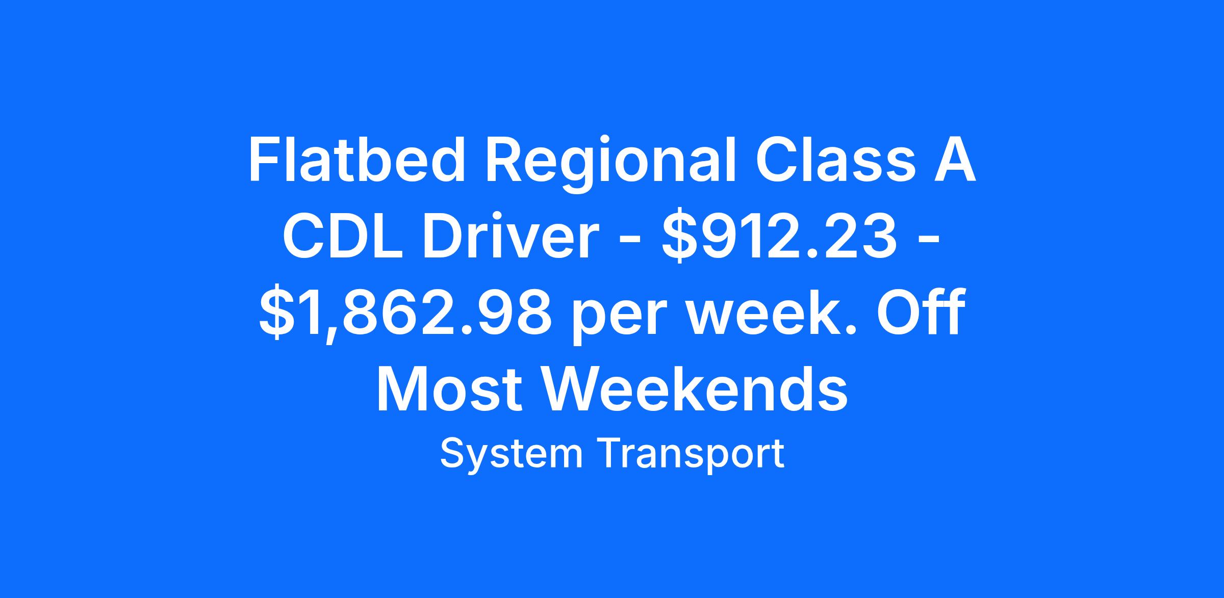 Flatbed Regional Class A CDL Driver - $912.23 - $1,862.98 per week. Off Most Weekends