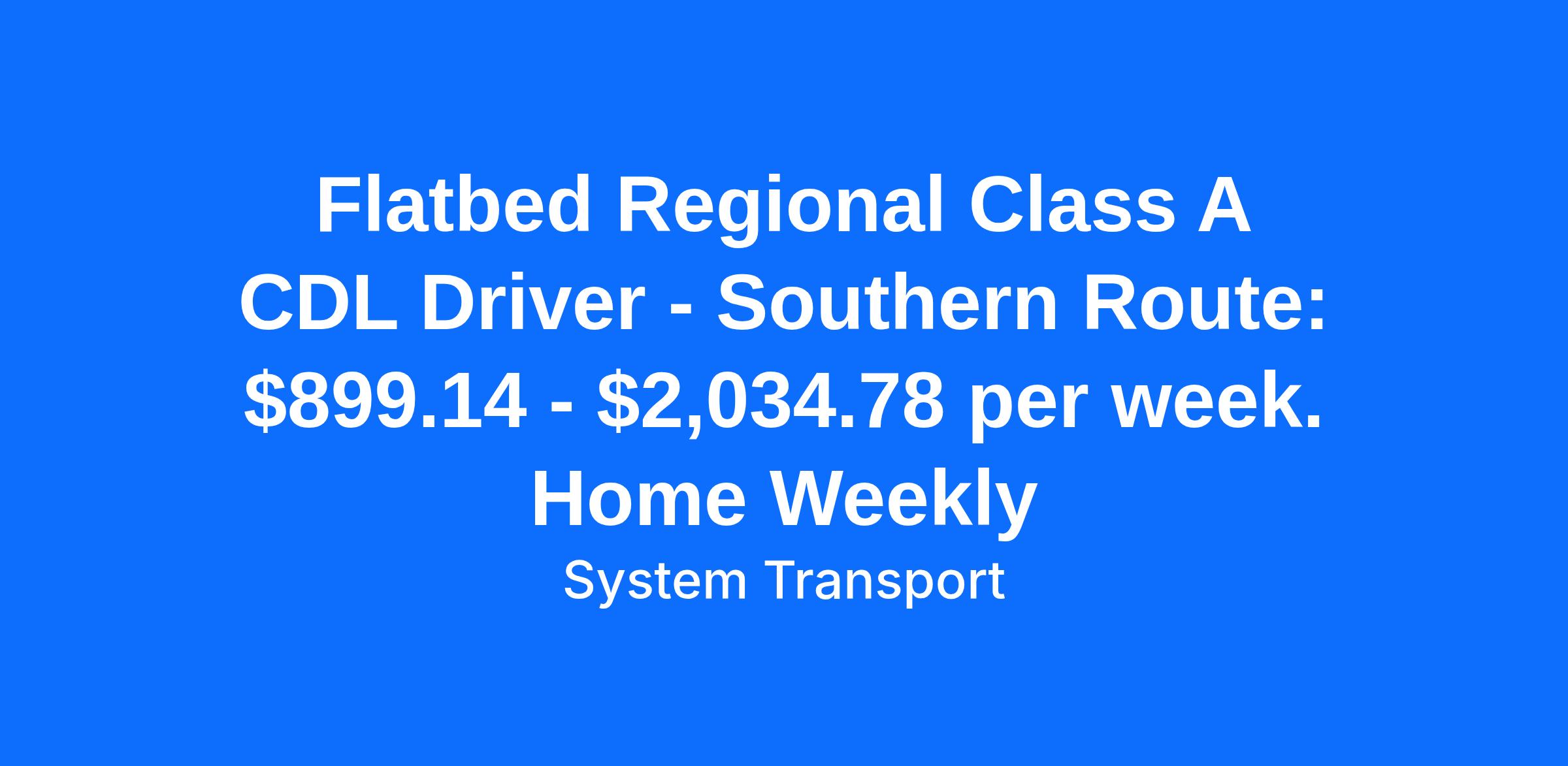 Flatbed CDL Driver, All Routes: $899.14 - $2,034.78/per week. Full BenefitsAMERICA PROUD. FLATBED STRONG. DRIVE SYSTEM TRANSPORT!Looking for an exciting driving opportunity in the western region of America? System Transport is hiring experienced CDL-A flatbed truck drivers for all routes! We offer regional, local, dedicated, and OTR routes. As a driver, you will transport important goods and materials such as glass, steel, aluminum, building materials, machinery, coils, and specialty metals. We offer competitive pay packages and excellent benefits. Join our team and become America Proud, Flatbed Strong with System Transport. Don't wait, apply now! OPPORTUNITY FOR CDL-A FLATBED TRUCK DRIVER