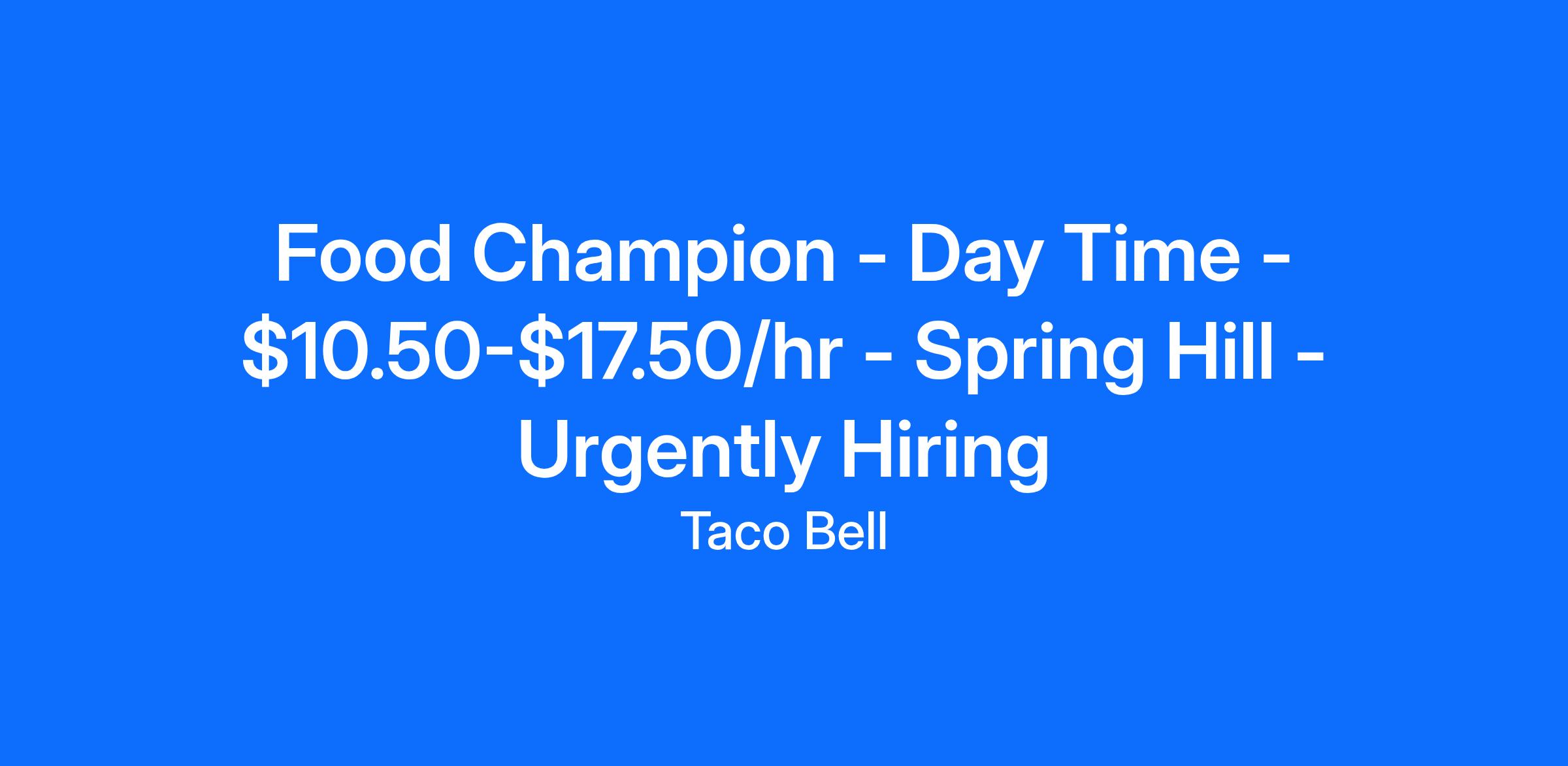 Food Champion - Day Time - $10.50-$17.50/hr - Spring Hill - Urgently Hiring
