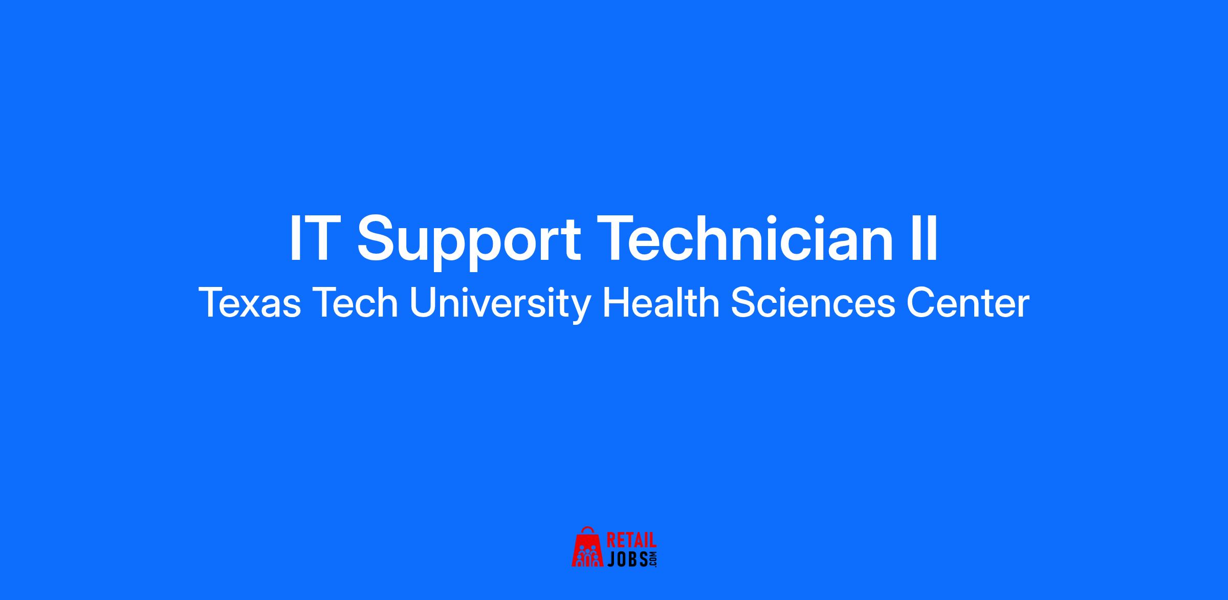 *Extended Job Title* IT Support Technician II *Position Description* The IT Support Technician II’s scope includes providing technical support and assistance to departments, faculty, staff, and students with the use of basic hardware and some software support and maintenance. This position will also specialize in hardware and software relevant to the department or unit. The IT Support Technician II’s scope includes providing technical support and assistance to departments, faculty, staff, and students with the use of basic hardware and some software support and maintenance. This position will also specialize in hardware and software relevant to the department or unit. *Requisition ID* 42478BR *Travel Required* Up to 25% *Pay Grade Maximum* 24.50 *Major/Essential Functions* * The IT Support Technician II's scope includes providing technical support and assistance to departments, faculty, staff, and students with the use of basic hardware and some software support and maintenance. * This position will also specialize in hardware and software relevant to the department or unit. * Non-technical skills required for this position include: Customer service orientation, collaborative interdependent work style, team oriented, strong communication skills (written, technical writing, verbal, listening), self-motivated and a strong ability to establish and maintain good working relationships with fellow employees, HSC staff and students. *Grant Funded?* No *Pay Grade Minimum* 22.00 *Pay Basis* Hourly *Work Location* Amarillo *Preferred Qualifications* * Recognized certification in PC Support field (Preferred CompTia A). * Experience with Microsoft Windows operating systems. * Advanced knowledge with Microsoft Office products. * Experience with network domain environments. * A strong ability to establish and maintain good working relationships with fellow employees, HSC staff and students. * Must be able to lift 10 to 50 pounds. *Department* ITSC PC Support Ama *Required Attachments* Cover Letter, Resume / CV *Job Type* Full Time *Pay Statement* Compensation is commensurate upon the qualifications of the individual selected and budgetary guidelines of the hiring department, as well as the institutional pay plan. For additional information, please reference the institutional pay plan website at [https://app4.ttuhsc.edu/payplan](https://app4.ttuhsc.edu/payplan/). *Shift* Day *EEO Statement* All qualified applicants will be considered for employment without regard to sex, race, color, national origin, religion, age, disability, protected veteran status, or genetic information. *Required Qualifications* Bachelor's degree with coursework in computer science, MIS, IT, or other related area plus one (1) year related full-time paid experience OR a combination of related education and/or experience to equal five (5) years. Applicants for this position will be subject to a criminal background check after a conditional offer of employment has been extended, but before employment can be confirmed. *Does this position work in a research laboratory?* No *Navy Enlisted Classification Code* CTT, IT *Army Military Occupational Specialty Code* 25B, 255A *Air Force Specialty Code* 3D1X1, 3D1X2 *Marine Military Occupational Specialty Code* 0651, 6694 *Jeanne Clery Act* The Jeanne Clery Disclosure of Campus Security Policy and Campus Crime Statistics Act is a federal statute requiring colleges and universities participating in federal financial aid programs to maintain and disclose campus crime statistics and security information. By October 1 of each year, institutions must publish and distribute their Annual Campus Security Policy & Crime Statistics Report (ASR) to current and prospective students and employees. To view this report, visit the TTUHSC Clery Act website at [https://www.ttuhsc.edu/compliance/clery-report.aspx](https://www.ttuhsc.edu/compliance/clery-report.aspx). *Introduction* Nationally recognized as a *[Great College to Work For](https://www.ttuhsc.edu/about/great-college/default.aspx)*, TTUHSC provides much more than just a job! Enjoy excellent *[benefits](https://www.ttuhsc.edu/human-resources/benefits/)*, including paid leave, retirement plans, wellness programs, health insurance and so much more. Ready to start building a rewarding career in a positive environment where you can develop and thrive? *Join us as we change the future of health care.* *About TTUHSC* Texas Tech University Health Sciences Center is enriching the lives of others by educating students, providing excellent patient care, and advancing knowledge through innovative research. TTUHSC graduates more health care professionals than any other health care institution in the state, conferring 24.2% of all degrees and certificates awarded from health-related institutions in Texas. By providing comprehensive clinical services to more than 10 million individuals across 121 counties, TTUHSC is dedicated to advancing the health of people throughout Texas and beyond. This is where world-class education meets compassionate patient care – and we believe that our people are the reason for our institution’s lasting success and bright future. Being part of the TTUHSC team means being part of an innovative and supportive community that empowers each individual to do their best work. Through our [values-based culture](https://www.ttuhsc.edu/human-resources/values-based-culture.aspx), TTUHSC is committed to cultivating an exceptional workplace community with a positive culture that puts people first. *Benefits* TTUHSC is committed to creating an environment where our team members can do their best work, with programs and [benefits](https://www.ttuhsc.edu/human-resources/benefits/) to support head-to-toe well-being. Explore just a few of the advantages of being a TTUHSC team member: * *Health Plans Supplemental Coverage Options – *Individual health insurance provided at no cost for full-time team members * *Paid Time Off* – Including holid