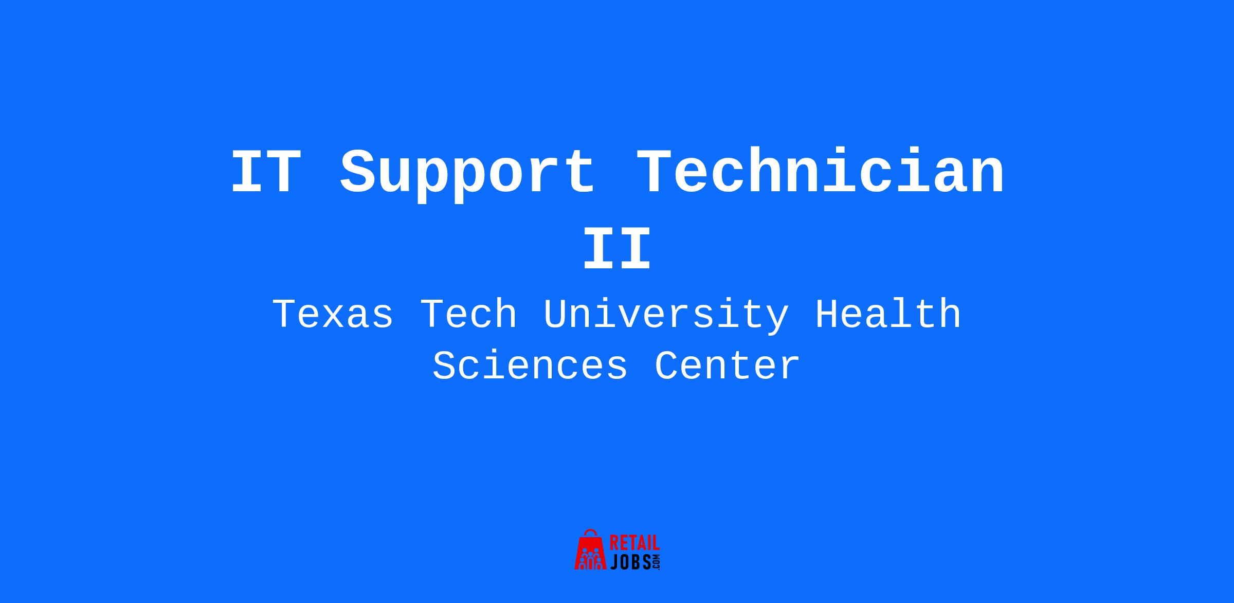 *Extended Job Title* IT Support Technician II *Position Description* The IT Support Technician II’s scope includes providing technical support and assistance to departments, faculty, staff, and students with the use of basic hardware and some software support and maintenance. This position will also specialize in hardware and software relevant to the department or unit. The IT Support Technician II’s scope includes providing technical support and assistance to departments, faculty, staff, and students with the use of basic hardware and some software support and maintenance. This position will also specialize in hardware and software relevant to the department or unit. *Requisition ID* 42478BR *Travel Required* Up to 25% *Pay Grade Maximum* 24.50 *Major/Essential Functions* * The IT Support Technician II's scope includes providing technical support and assistance to departments, faculty, staff, and students with the use of basic hardware and some software support and maintenance. * This position will also specialize in hardware and software relevant to the department or unit. * Non-technical skills required for this position include: Customer service orientation, collaborative interdependent work style, team oriented, strong communication skills (written, technical writing, verbal, listening), self-motivated and a strong ability to establish and maintain good working relationships with fellow employees, HSC staff and students. *Grant Funded?* No *Pay Grade Minimum* 22.00 *Pay Basis* Hourly *Work Location* Amarillo *Preferred Qualifications* * Recognized certification in PC Support field (Preferred CompTia A). * Experience with Microsoft Windows operating systems. * Advanced knowledge with Microsoft Office products. * Experience with network domain environments. * A strong ability to establish and maintain good working relationships with fellow employees, HSC staff and students. * Must be able to lift 10 to 50 pounds. *Department* ITSC PC Support Ama *Required Attachments* Cover Letter, Resume / CV *Job Type* Full Time *Pay Statement* Compensation is commensurate upon the qualifications of the individual selected and budgetary guidelines of the hiring department, as well as the institutional pay plan. For additional information, please reference the institutional pay plan website at [https://app4.ttuhsc.edu/payplan](https://app4.ttuhsc.edu/payplan/). *Shift* Day *EEO Statement* All qualified applicants will be considered for employment without regard to sex, race, color, national origin, religion, age, disability, protected veteran status, or genetic information. *Required Qualifications* Bachelor's degree with coursework in computer science, MIS, IT, or other related area plus one (1) year related full-time paid experience OR a combination of related education and/or experience to equal five (5) years. Applicants for this position will be subject to a criminal background check after a conditional offer of employment has been extended, but before employment can be confirmed. *Does this position work in a research laboratory?* No *Navy Enlisted Classification Code* CTT, IT *Army Military Occupational Specialty Code* 25B, 255A *Air Force Specialty Code* 3D1X1, 3D1X2 *Marine Military Occupational Specialty Code* 0651, 6694 *Jeanne Clery Act* The Jeanne Clery Disclosure of Campus Security Policy and Campus Crime Statistics Act is a federal statute requiring colleges and universities participating in federal financial aid programs to maintain and disclose campus crime statistics and security information. By October 1 of each year, institutions must publish and distribute their Annual Campus Security Policy & Crime Statistics Report (ASR) to current and prospective students and employees. To view this report, visit the TTUHSC Clery Act website at [https://www.ttuhsc.edu/compliance/clery-report.aspx](https://www.ttuhsc.edu/compliance/clery-report.aspx). *Introduction* Nationally recognized as a *[Great College to Work For](https://www.ttuhsc.edu/about/great-college/default.aspx)*, TTUHSC provides much more than just a job! Enjoy excellent *[benefits](https://www.ttuhsc.edu/human-resources/benefits/)*, including paid leave, retirement plans, wellness programs, health insurance and so much more. Ready to start building a rewarding career in a positive environment where you can develop and thrive? *Join us as we change the future of health care.* *About TTUHSC* Texas Tech University Health Sciences Center is enriching the lives of others by educating students, providing excellent patient care, and advancing knowledge through innovative research. TTUHSC graduates more health care professionals than any other health care institution in the state, conferring 24.2% of all degrees and certificates awarded from health-related institutions in Texas. By providing comprehensive clinical services to more than 10 million individuals across 121 counties, TTUHSC is dedicated to advancing the health of people throughout Texas and beyond. This is where world-class education meets compassionate patient care – and we believe that our people are the reason for our institution’s lasting success and bright future. Being part of the TTUHSC team means being part of an innovative and supportive community that empowers each individual to do their best work. Through our [values-based culture](https://www.ttuhsc.edu/human-resources/values-based-culture.aspx), TTUHSC is committed to cultivating an exceptional workplace community with a positive culture that puts people first. *Benefits* TTUHSC is committed to creating an environment where our team members can do their best work, with programs and [benefits](https://www.ttuhsc.edu/human-resources/benefits/) to support head-to-toe well-being. Explore just a few of the advantages of being a TTUHSC team member: * *Health Plans Supplemental Coverage Options – *Individual health insurance provided at no cost for full-time team members * *Paid Time Off* – Including holid
