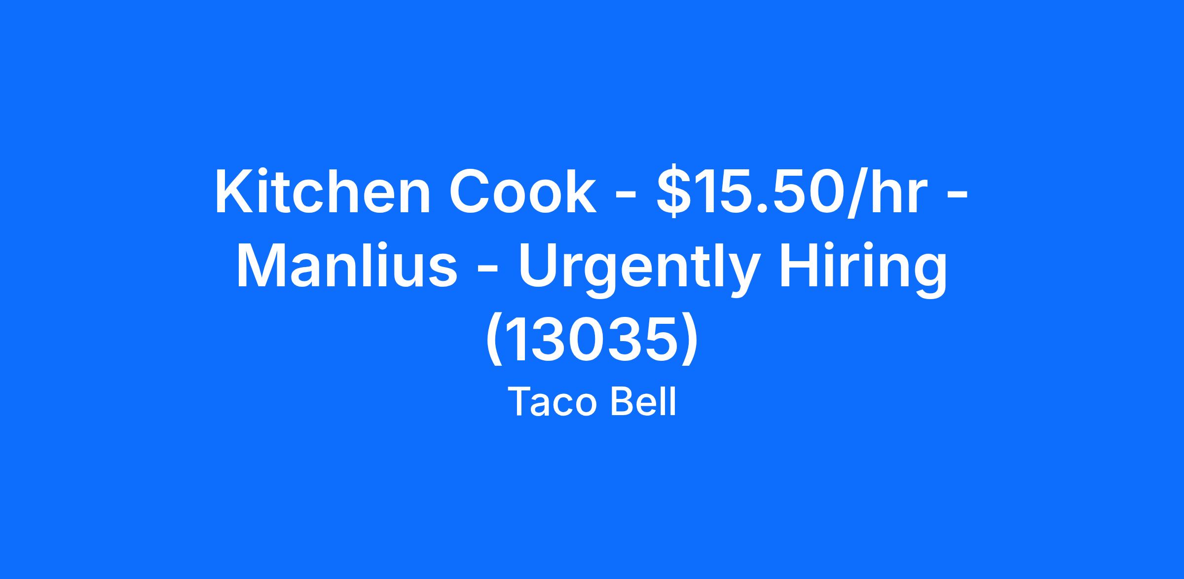 Taco Bell Manlius is looking for a hardworking individual to join our kitchen team as a full time or part time Kitchen Cook in Manlius, NY. As part of the BOH team, you'll be responsible for food preparation that meets or exceeds hospitality and service standards, and must be able to prepare all foods to meet quantity and deadline requirements.