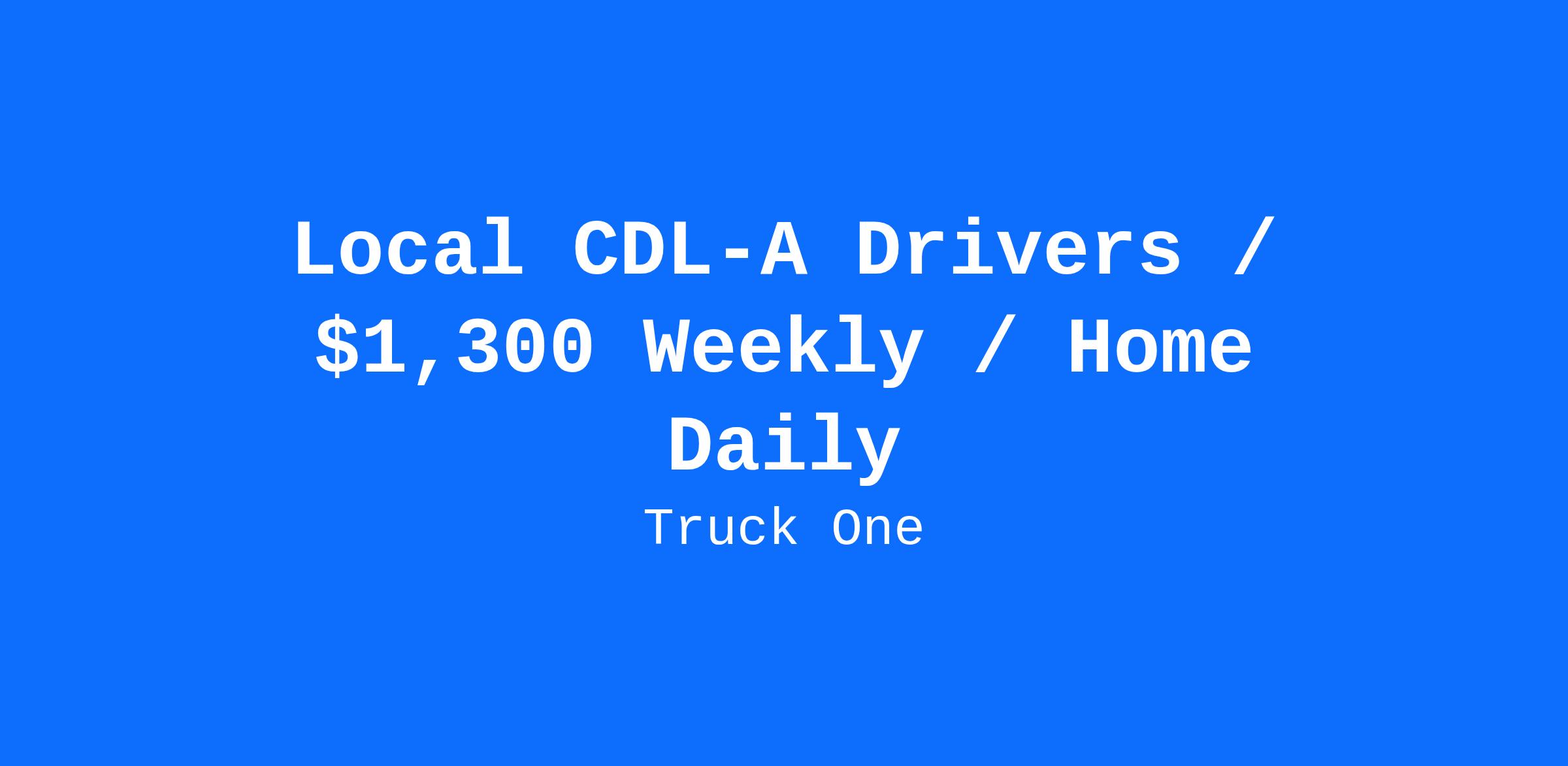 Truck One is Hiring Local Company Drivers. Make $1,300 per week and get home daily! Benefits:$1,300 per weekHome DailyNew/Late Model EquipmentPaid Weekly/Direct DepositTwo Weeks Earned Time OffSix Paid HolidaysMajor Medical Coverage/Vision and DentalRetirement PlanFast and Easy OrientationDriver Referral Bonus ProgramFuel Card ProvidedPre-Pass Provided Requirements:Valid CDL AAt least 1 year of experience About Truck One IncTruck One, Inc. is a family-oriented company providing services to the transportation industry since 1947. We offer many regional lanes to fit your lifestyle. Specializing in quality, on time service, Truck One has built its reputation on the professionalism and reliability of our drivers.Truck One Inc is an Equal Opportunity Employer. All qualified applicants will receive consideration for employment without regard to sex, gender identity, sexual orientation, race, color, religion, national origin, disability, protected Veteran status, age, or any other characteristic protected by applicable law.