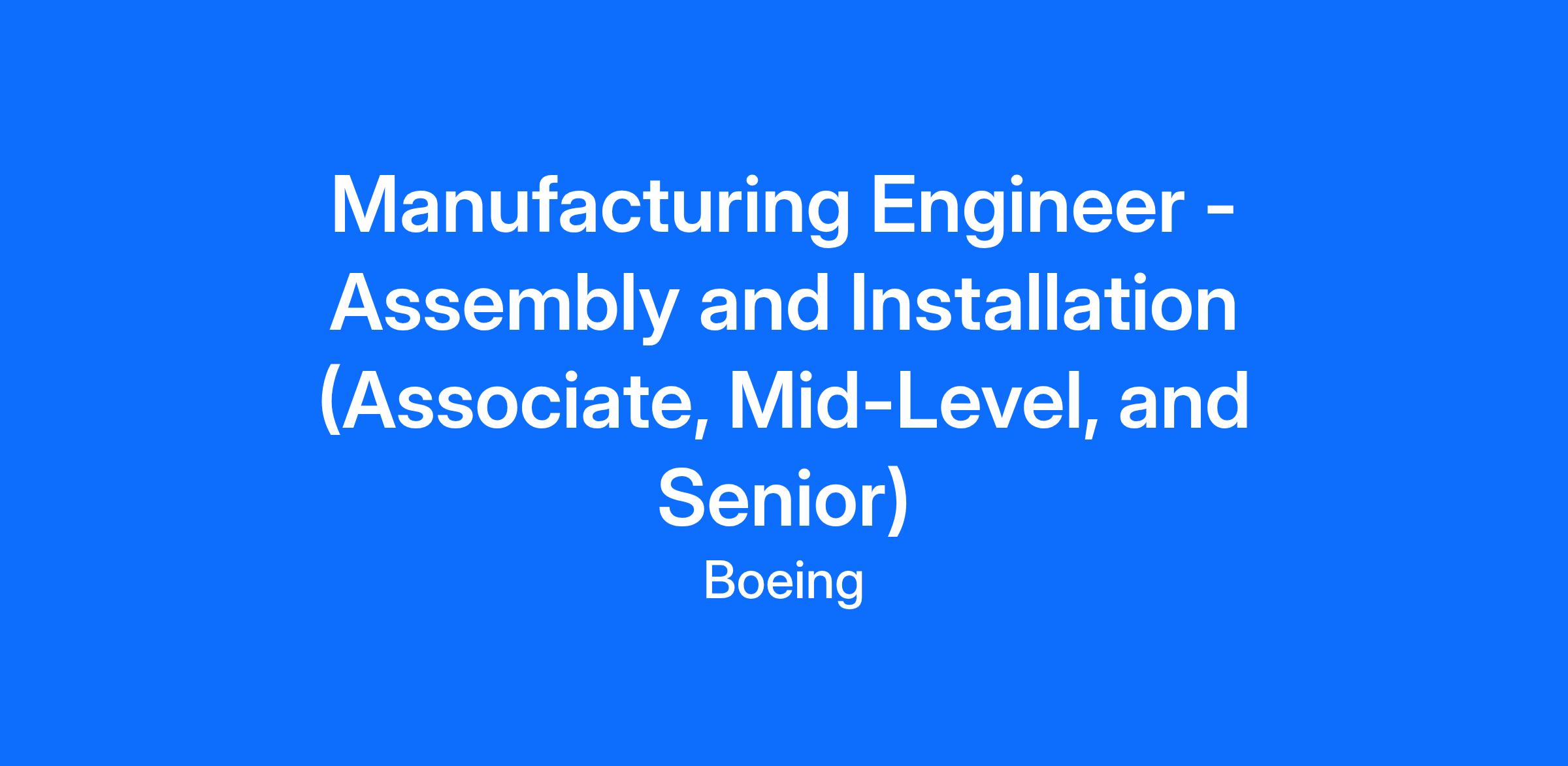 Boeing Commercial Airplanes is hiring Associate, Mid-Level, and Senior Manufacturing Engineers to support operations in Everett, WA. Positions will support one of the following areas: 777/777X programs, Interior Responsibility Center, Propulsions, or Electrical Systems Responsibility Center. Successful candidates will thrive in a fast-paced environment and collaborate effectively with engineering teams and mechanics on the factory floor.