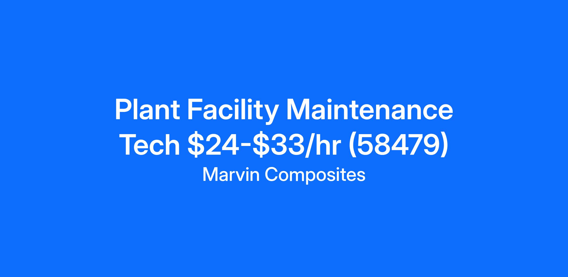 Marvin Composites is hiring a Facility Maintenance Technician for our extrusion plant in Fargo, ND. In this role, you'll work to keep our newer equipment and facility systems running at their best. Your focus will be on preventive and predictive maintenance, along with troubleshooting and repairs when needed. You'll plan your work, coordinate with production teams, and take ownership of keeping operations efficient and reliable. We'll support your growth with training and development opportunities so you can continue building your skills and advancing your career.