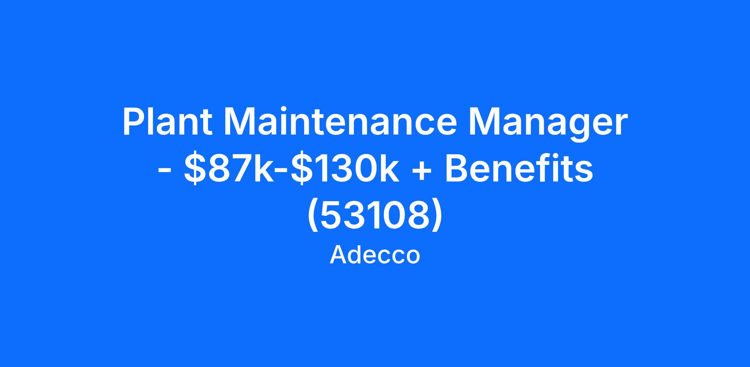 Manufacturing | On-site (Cudahy WI)Salary: $87k-$130k DOESchedule: Monday–Friday, 6:30 AM – 4:00 PM | Rotating weekendsBenefits: Medical, Dental, Vision, 401k, Education reimbursementPosition SummaryThe Maintenance Manager is responsible for leading maintenance strategy, people, and systems to ensure reliable equipment performance and minimal downtime in a manufacturing environment. This role partners closely with Operations and Engineering to support production goals, improve asset reliability, and maintain a safe, efficient facility.