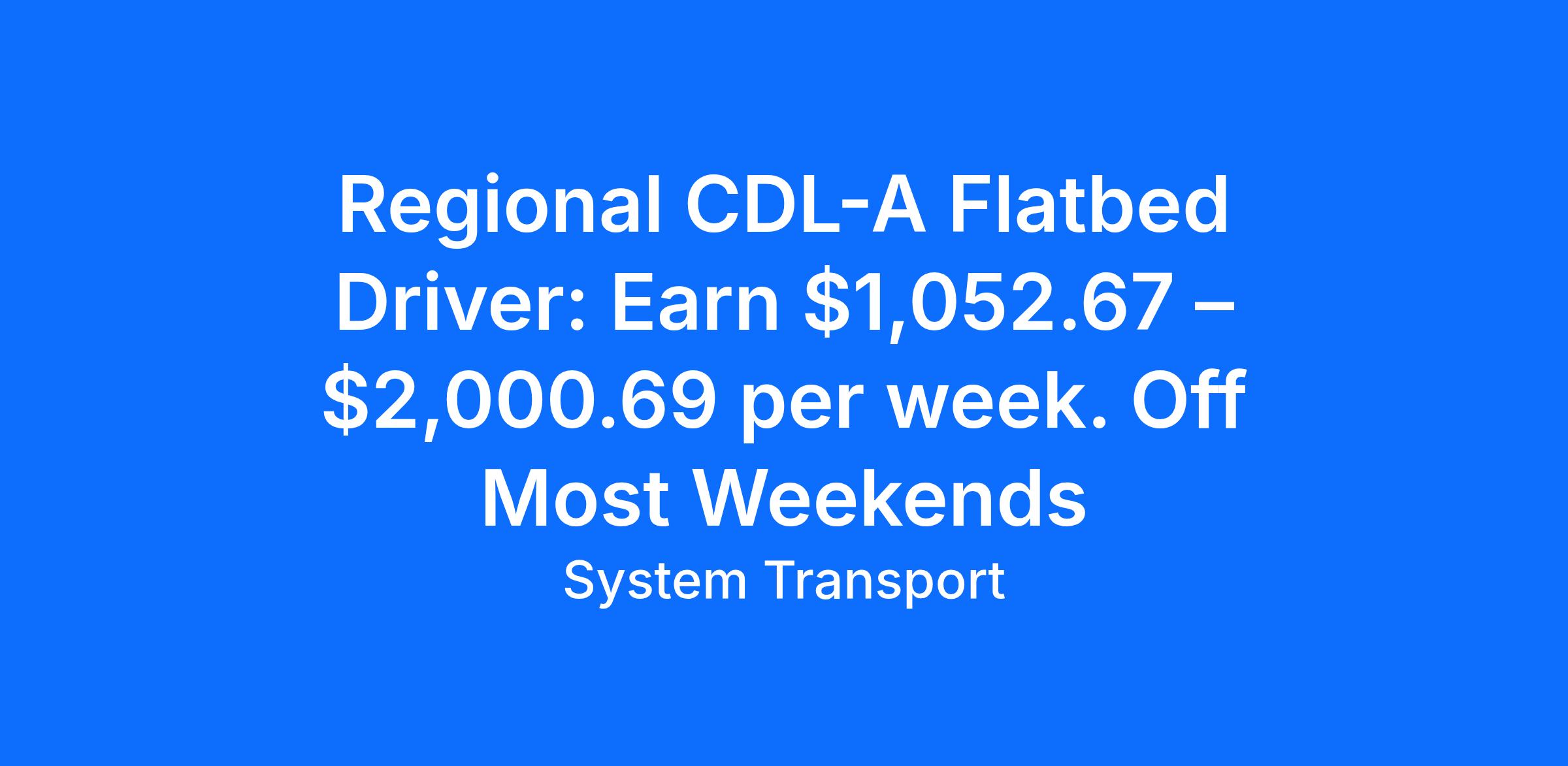 Flatbed CDL A Driver, Regional Route: $1,052.67 – $2,000.69 per week. Off Most WeekendsLooking for an exciting driving opportunity in the western region of America? System Transport is hiring experienced CDL-A flatbed truck drivers for their regional division 295. As a driver, you will be transporting important goods and materials such as glass, steel, aluminum, building materials, machinery, coils, and specialty metals. We offer competitive pay packages and excellent benefits. Join our team and become America Proud, Flatbed Strong with System Transport. Don't wait, this offer is limited - apply now!