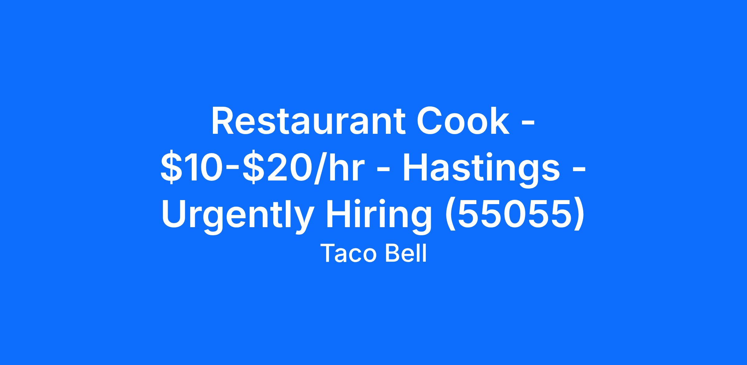 Taco Bell - Hastings is looking for a Restaurant Cook to join our team in Hastings, MN. This position is full time or part time. The restaurant cook is responsible for food preparation that meets or exceeds hospitality and service standards and must be able to prepare all foods to meet quantity and deadline requirements. As a restaurant cook at Taco Bell - Hastings you will prepare food items according to the menu, recipes, and special dietary or nutritional restrictions. You will also determine food and supplies needed to keep the kitchen running and stocked during service. Cooks make sure that proper health procedures are followed. You should maintain or exceed standards of appearance, cleanliness, hygiene, and health. Previous cook, line cook, prep cook, sous chef or other back of house (BOH) experience is beneficial. High school diploma or equivalent preferred but not mandatory. Food Handlers certification or willingness to obtain. Most importantly, a strong work ethic and a willingness to learn will help you go far at Taco Bell - Hastings.