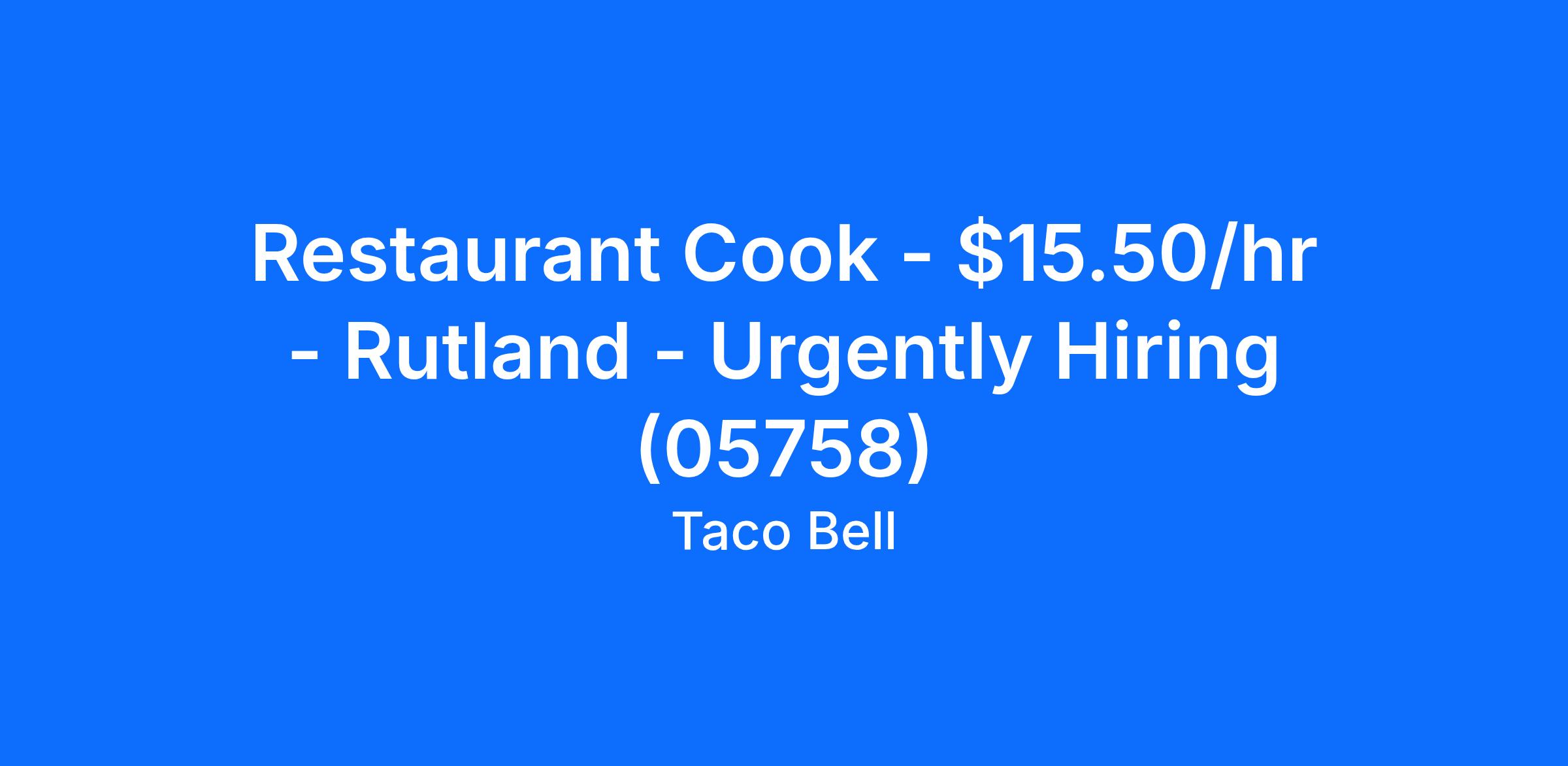 Taco Bell- Rutland is looking for a Restaurant Cook to join our team in Rutland, VT. This position is full time or part time. The restaurant cook is responsible for food preparation that meets or exceeds hospitality and service standards and must be able to prepare all foods to meet quantity and deadline requirements. As a restaurant cook at Taco Bell- Rutland you will prepare food items according to the menu, recipes, and special dietary or nutritional restrictions. You will also determine food and supplies needed to keep the kitchen running and stocked during service. Cooks make sure that proper health procedures are followed. You should maintain or exceed standards of appearance, cleanliness, hygiene, and health. Previous cook, line cook, prep cook, sous chef or other back of house (BOH) experience is beneficial. High school diploma or equivalent preferred but not mandatory. Food Handlers certification or willingness to obtain. Most importantly, a strong work ethic and a willingness to learn will help you go far at Taco Bell- Rutland.