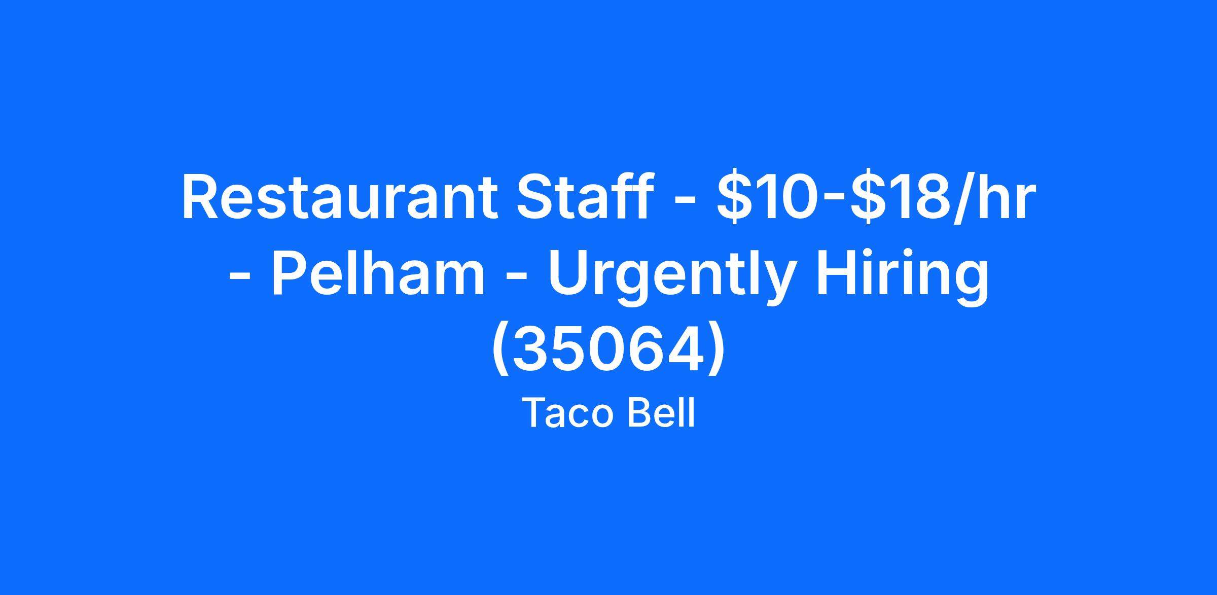 Taco Bell - Pelham is looking for a full time or part time Restaurant Staff team member to join our team in Pelham, AL. The Restaurant Staff team member is responsible for customer service and commitment to excellence through meeting or exceeding hospitality and service standards.