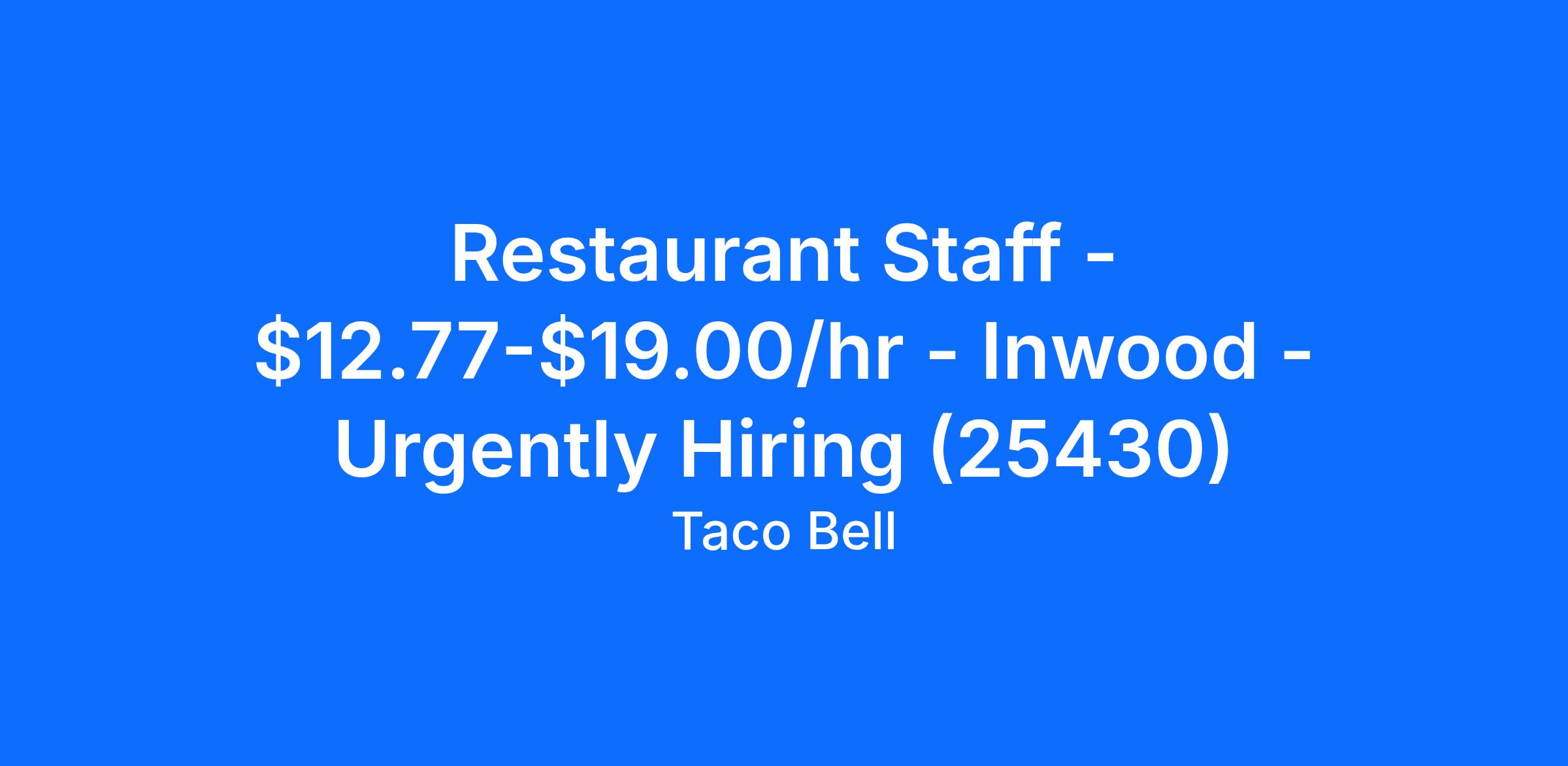 Restaurant Staff - $12.77-$19.00/hr - Inwood - Urgently Hiring (25430)