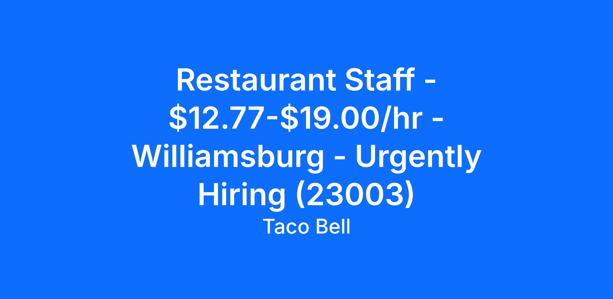 Restaurant Staff - $12.77-$19.00/hr - Williamsburg - Urgently Hiring (23003)