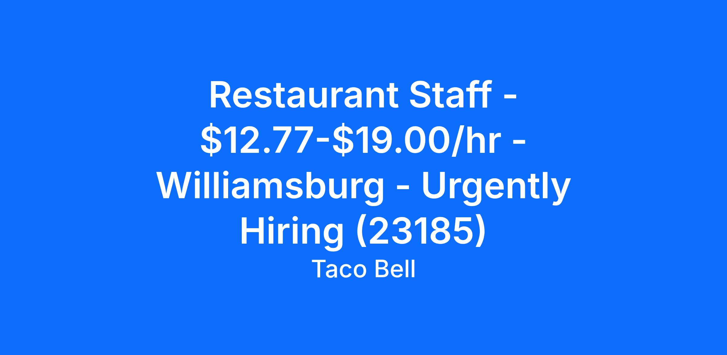 Restaurant Staff - $12.77-$19.00/hr - Williamsburg - Urgently Hiring (23185)
