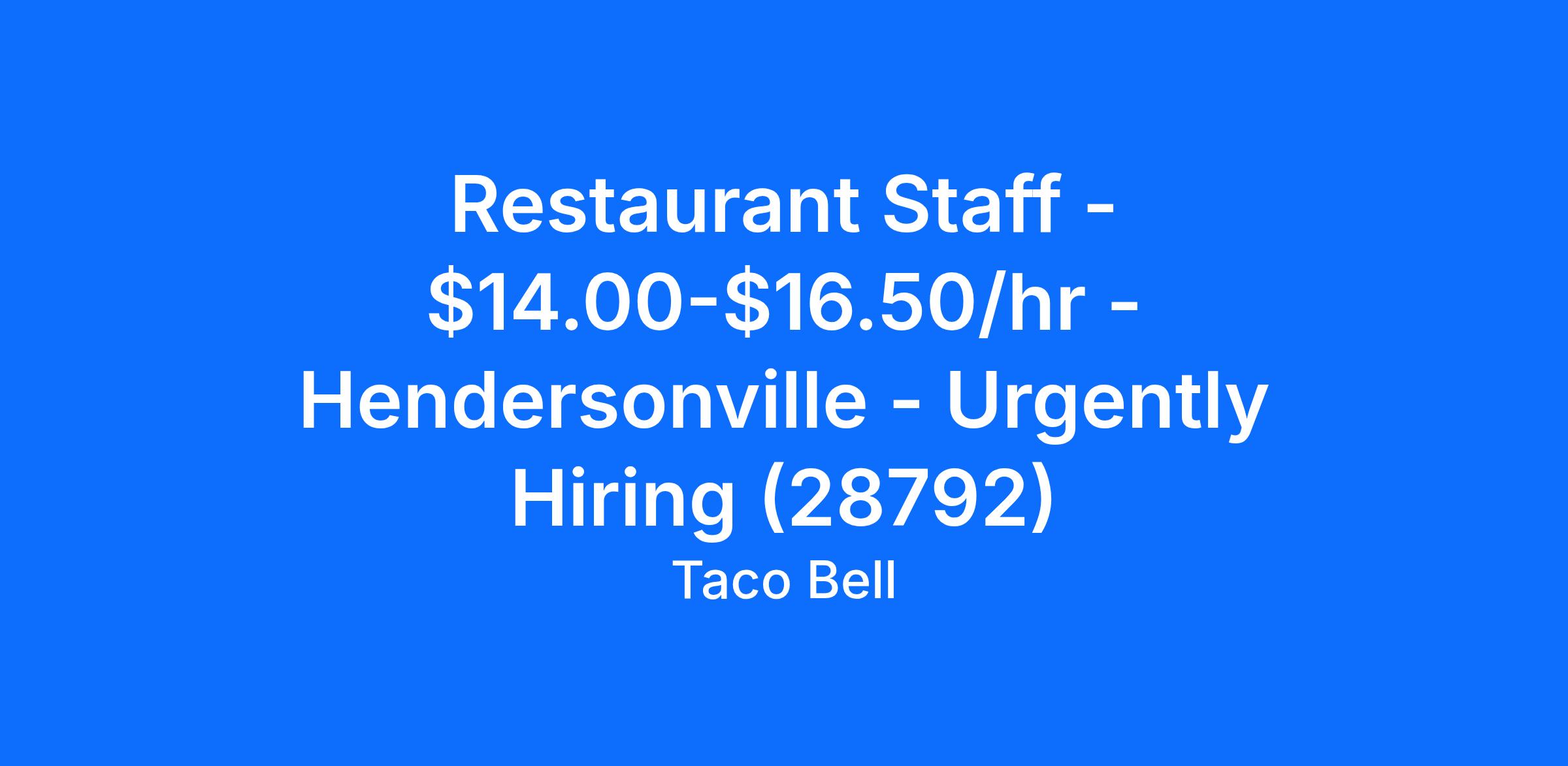 Taco Bell - Hendersonville is looking for a full time or part time Restaurant Staff team member to join our team in Hendersonville, NC. The Restaurant Staff team member is responsible for customer service and commitment to excellence through meeting or exceeding hospitality and service standards.