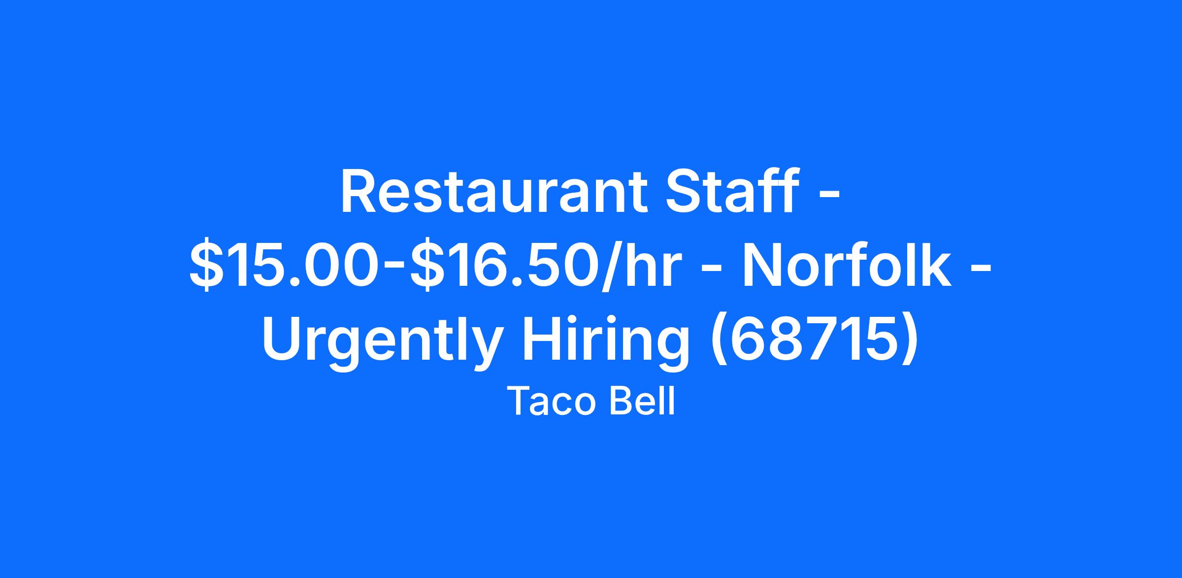 Taco Bell - Norfolk is looking for a full time or part time Restaurant Staff team member to join our team in Norfolk, NE. The Restaurant Staff team member is responsible for customer service and commitment to excellence through meeting or exceeding hospitality and service standards.