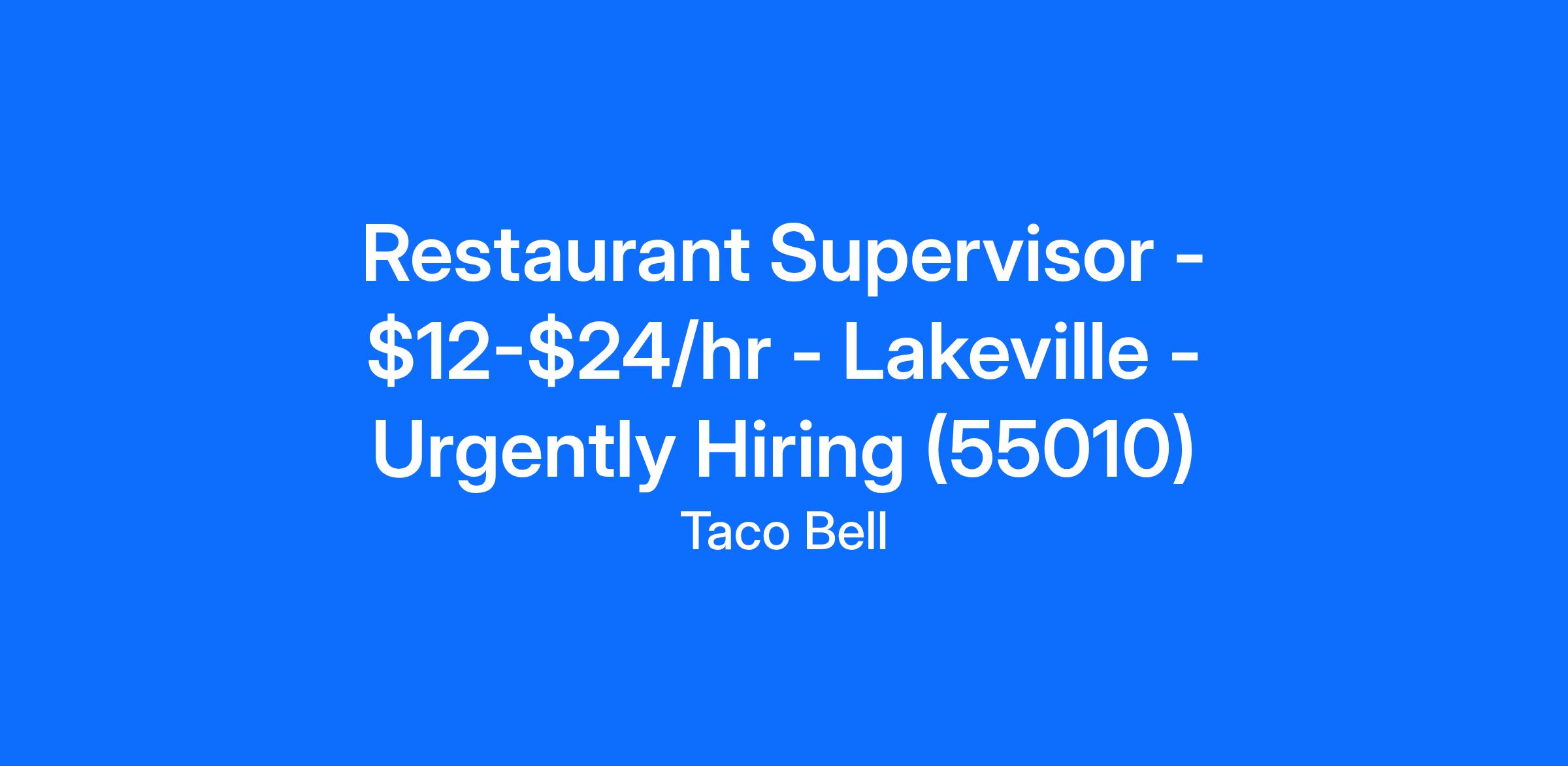 Taco Bell - Lakeville Theater is currently hiring a full time or part time Restaurant Supervisor for our Lakeville, MN location. A Restaurant Supervisor should not only supervise their team but lead it to acheive their goals. A Restaurant Supervisor will assist in the planning and management at Taco Bell - Lakeville Theater in order to achieve customer satisfaction, quality service, compliance with store policies all while meeting and/or exceeding financial goals. Applicants for this role should have effective verbal and written communication skills.