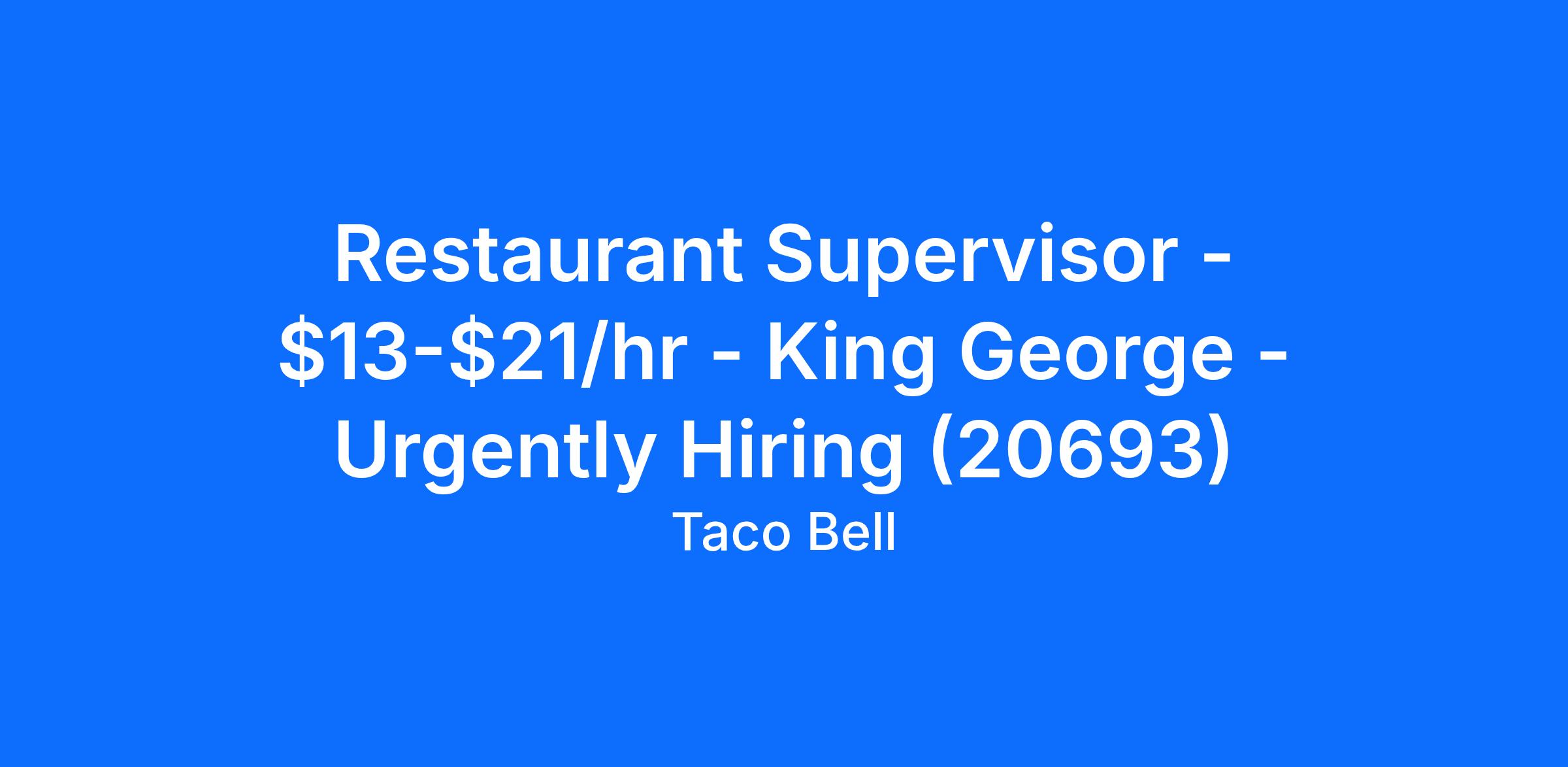 Taco Bell Dahlgren is currently hiring a full time or part time Restaurant Supervisor for our King George, VA location. A Restaurant Supervisor should not only supervise their team but lead it to acheive their goals. A Restaurant Supervisor will assist in the planning and management at Taco Bell Dahlgren in order to achieve customer satisfaction, quality service, compliance with store policies all while meeting and/or exceeding financial goals. Applicants for this role should have effective verbal and written communication skills.
