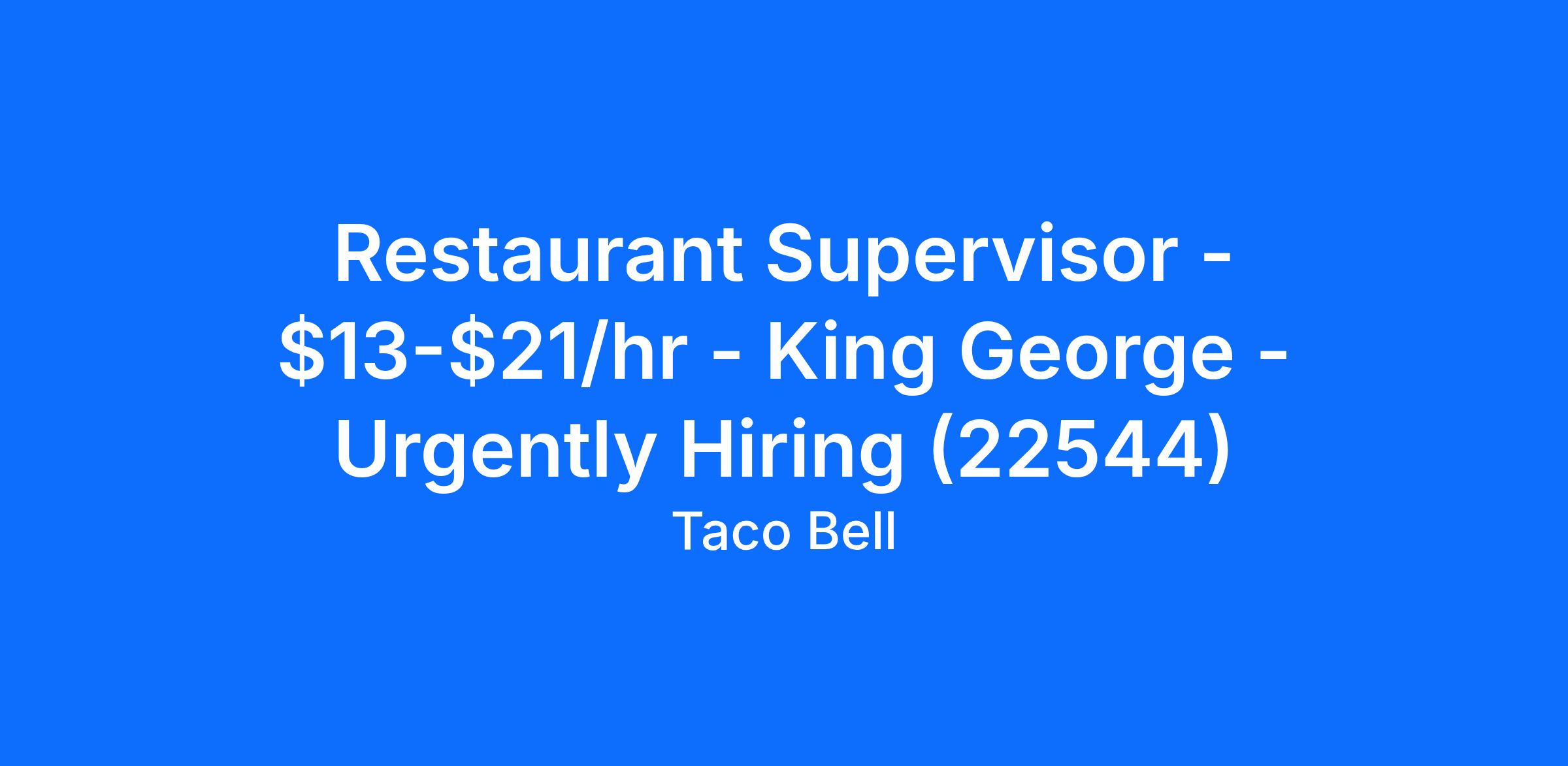 Taco Bell Dahlgren is currently hiring a full time or part time Restaurant Supervisor for our King George, VA location. A Restaurant Supervisor should not only supervise their team but lead it to acheive their goals. A Restaurant Supervisor will assist in the planning and management at Taco Bell Dahlgren in order to achieve customer satisfaction, quality service, compliance with store policies all while meeting and/or exceeding financial goals. Applicants for this role should have effective verbal and written communication skills.