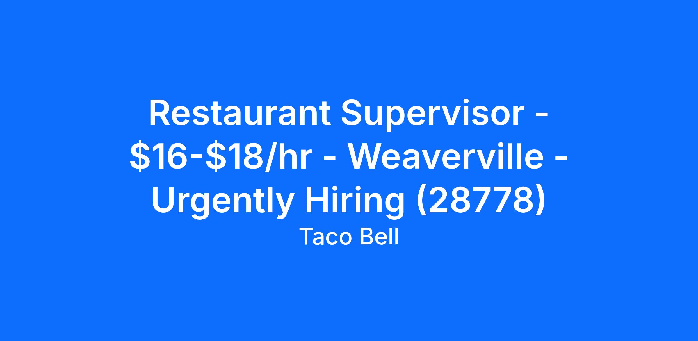 Taco Bell - Weaverville is currently hiring a full time or part time Restaurant Supervisor for our Weaverville, NC location. A Restaurant Supervisor should not only supervise their team but lead it to acheive their goals. A Restaurant Supervisor will assist in the planning and management at Taco Bell - Weaverville in order to achieve customer satisfaction, quality service, compliance with store policies all while meeting and/or exceeding financial goals. Applicants for this role should have effective verbal and written communication skills.