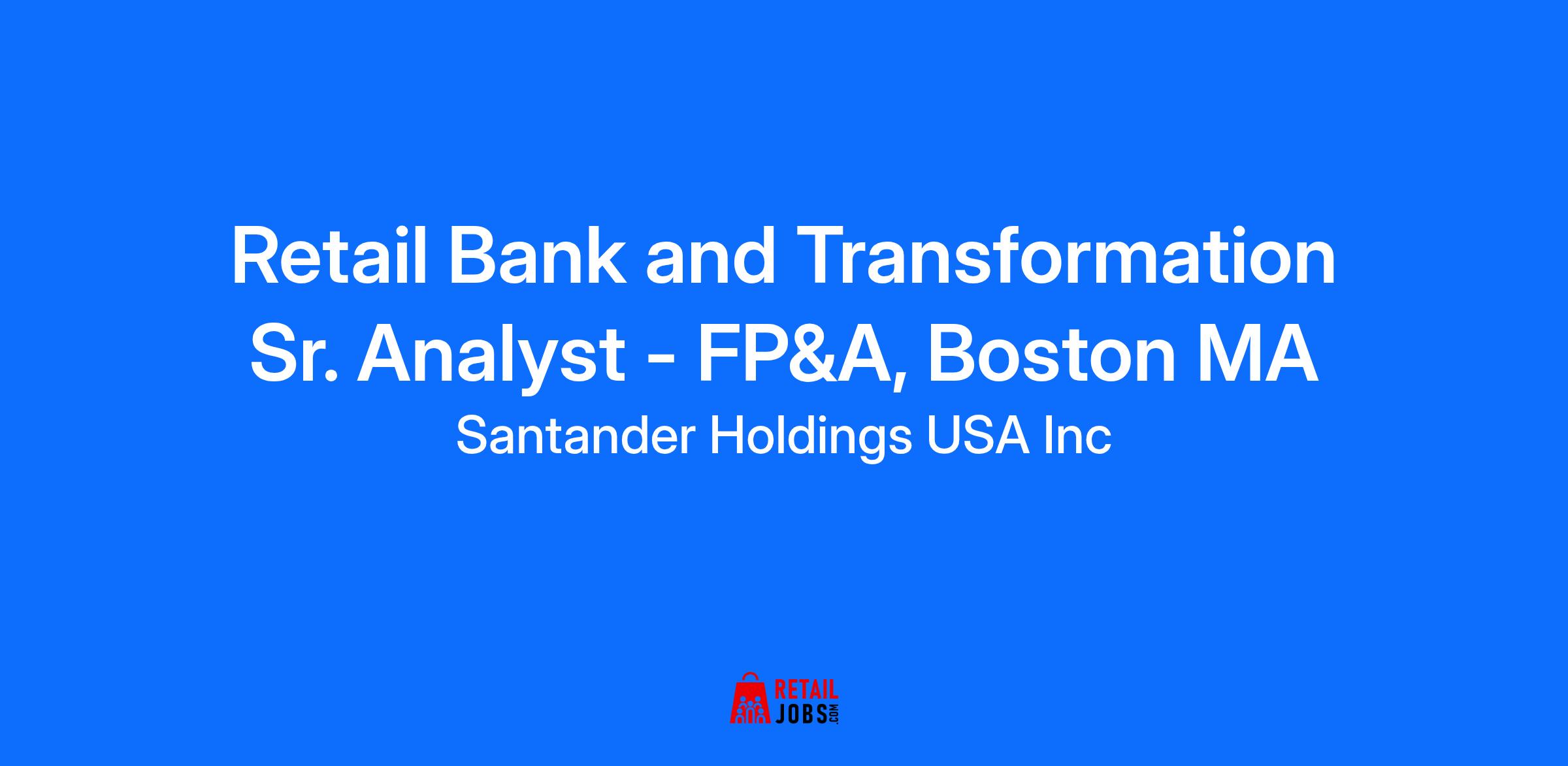 Retail Bank and Transformation Sr. Analyst - FP&A, Boston MA Country: United States of America Your Journey Starts Here: Santander is a global leader and innovator in the financial services industry. We believe that our employees are our greatest asset. Our focus is on fostering an enriching journey that empowers you to explore diverse career opportunities while nurturing your personal growth. We are committed to creating an environment where continuous learning and development are prioritized, enabling you to thrive both professionally and personally. Here, you will find ample opportunities to connect and collaborate with talented colleagues from around the world, sharing insights and driving innovation together. Join us at Santander, where you are supported by a culture of engagement and a commitment to your success. An exciting journey awaits, if you are interested in exploring the possibilities We Want to Talk to You! The Difference You Make: Generates forecasts and analyzes trends in revenue-generating organizations, finance and other areas of business for financial and strategic planning purposes. Conducts financial and economic analysis and forecasting and evaluates alternate financial plans. Prepares, analyzes, interprets and maintains internal and external information related to economic policy, rates of return, depreciation, investments and operational and financial results. Analyzes profit-and-loss income statements and prepares reports on findings to make budgeting and cost recommendations to management. Essential Functions/Responsibilty Statements: Assists in the day-to-day preparation of financial planning, reporting, analytics, modeling, etc. Follows standardized operating procedures and practices, conducts or assists in the documentation of simple financial analysis projects. Analyzes key data during the execution of organizational projects aimed at improving efficiency and/or increase the Company's operating quality standards. Conducts research and analysis to provide management throughout the company with definitive financial data and advice for their use in setting and realizing profit objectives. What You Bring: To perform this job successfully, an individual must be able to perform each essential duty satisfactorily. The requirements listed below are representative of the knowledge, skill, and/or ability required. Reasonable accommodations may be made to enable individuals with disabilities to perform the essential functions. Education: Bachelor's Degree or equivalent work experience Work Experience: 2-6 years ; Financial planning, Financial analysis, Budgeting, or similar field, preference for prior experience supporting the financials for a credit card portfolio It Would Be Nice For You To Have: Excellent communications and organizational skills. Detail oriented with ability to research, organize and analyze financial data. Ability to focus on details. Proficient data entry skills; Microsoft Office (Word, Excel, Access). Strong verbal and written communication skills. Basic knowledge of financial analysis and budgeting procedures. Ability to work well with teams as well as independently. EEO Statement: At Santander, we value and respect differences in our workforce. We actively encourage everyone to apply. Santander is an equal opportunity employer. All qualified applicants will receive consideration for employment without regard to race, color, religion, sex, sexual orientation, gender identity, national origin, genetics, disability, age, veteran status or any other characteristic protected by law. Working Conditions: Frequent Minimal physical effort such as sitting, standing and walking. Occasional moving and lifting equipment and furniture is required to support onsite and offsite meeting setup and teardown. Physically capable of lifting up to fifty pounds, able to bend, kneel, climb ladders. Employer Rights: Employer Rights: This job description does not list all of the job duties of the job. You may be asked by your supervisors or managers to perform other duties. You may be evaluated in part based upon your performance of the tasks listed in this job description. The employer has the right to revise this job description at any time. This job description is not a contract for employment and either you or the employer may terminate at any time for any reason. What Else You Need To Know : The base pay range for this position is posted below and represents the annualized salary range. For hourly positions (non-exempt), the annual range is based on a 40-hour work week. The exact compensation may vary based on skills, experience, training, licensure and certifications and location. Base Pay Range Minimum: $56,250.00 USD Maximum: $97,500.00 USD Link to Santander Benefits: Santander Benefits - 2025 Santander OnGoing/NH eGuide (foleon.com) Risk Culture: We embrace a strong risk culture and all of our professionals at all levels are expected to take a proactive and responsible approach toward risk management. EEO Statement: At Santander, we value and respect differences in our workforce. We actively encourage everyone to apply. Santander is an equal opportunity employer. All qualified applicants will receive consideration for employment without regard to race, color, religion, sex, sexual orientation, gender identity, national origin, genetics, disability, age, veteran status or any other characteristic protected by law. Working Conditions : Frequent minimal physical effort such as sitting, standing and walking is required for this role. Depending on location, occasional moving and lifting light equipment and/or furniture may be required . Employer Rights: This job description does not list all of the job duties of the job. You may be asked by your supervisors or managers to perform other duties. You may be evaluated in part based upon your performance of the tasks listed in this job description. The employer has the right to revise this job description at any time. Th