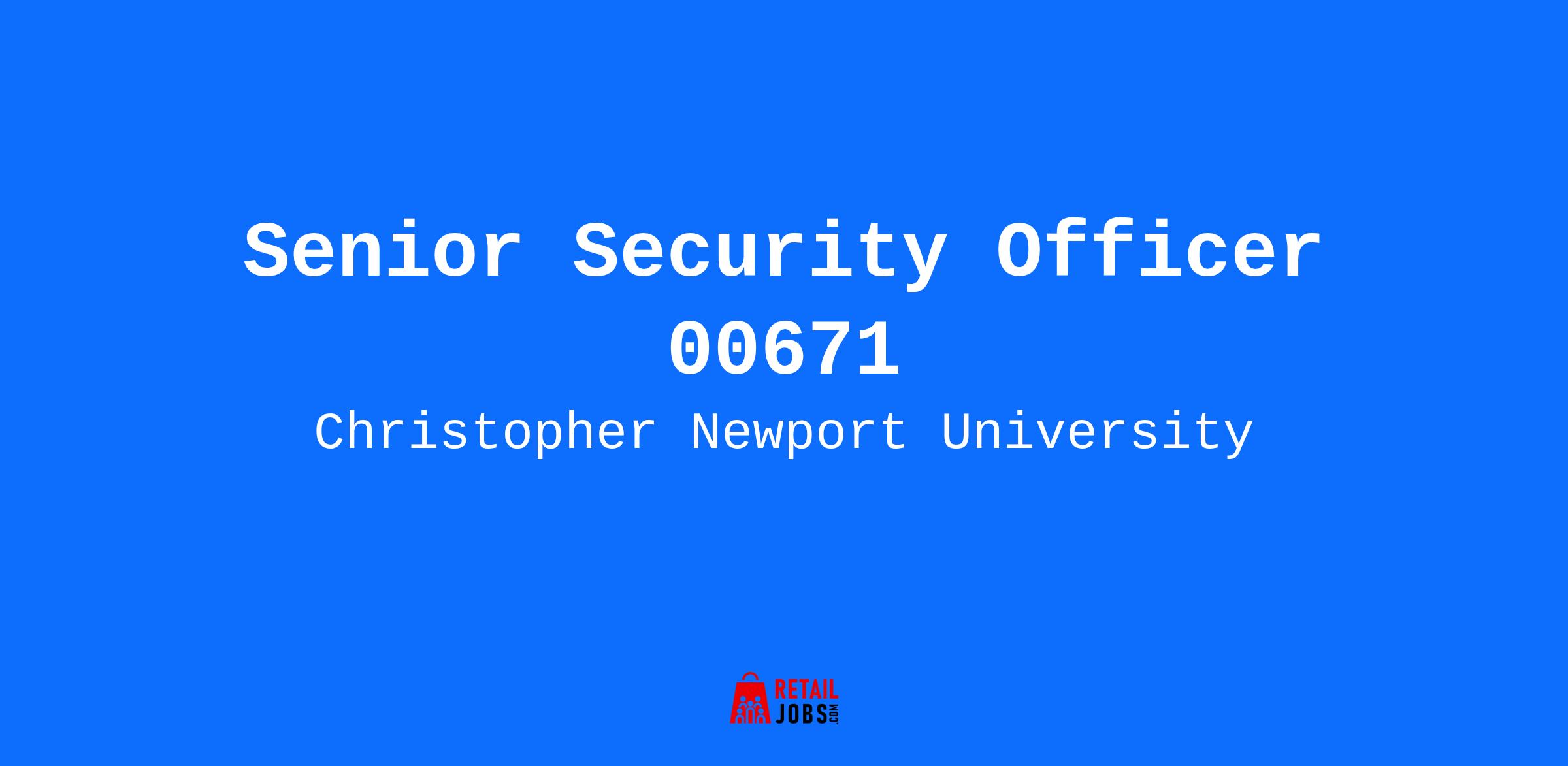 *Working Title:*Senior Security Officer 00671 *Role Title:*Security Officer III *Position Number:*00671 *FLSA:*Non Exempt *Appointment Type:*Full Time *Type of Posting:*General Public *Is Sensitive Position?:*Yes *If Sensitive Position, please paste statement:*This position is a sensitive position and requires that finalist applicants undergo a fingerprint-based criminal history check. *Designated Personnel:*Yes *Responsible Employee:*This position is designated as a “responsible employee” who has the authority to redress sexual violence, who has the duty to report incidents of sexual violence or other student misconduct, or who a student could reasonably believe has this authority or duty. *If Designated Personnel, please paste statement:*This position is a “designated position” meaning this position could potentially be required to work (depending on the event) during an emergency closing. *Statement of Economic Interest:*No *Is this a restricted position subject to availability of funding?:*No *Departmental Objective:*The University Police Department’s mission is to patrol the University properties helping to assure the safety and well-being of students, faculty, staff and visitors to the campus by using the philosophy of community policing. The Department’s mission will be achieved through a proactive, community service approach to problem resolution and by offering crime prevention programs on safety, self-protection, substance abuse, sexual assault, and protection of personal belongings. This mission will be the charge of every employee of this Department. The Security Section within the CNU Police Department is responsible for the safety and security of the faculty, staff, students, guests and the property of the Commonwealth of Virginia and Christopher Newport University. *Purpose of the Position:*The purpose of this position is to provide world class physical security services for designated locations and events, primarily the Mary M. Torggler Fine Arts Center, to protect the museum’s collection, life and property and to ensure a safe and secure business and educational environment so that arts and education programs can be accomplished by the operating staff, faculty, students, and visitors. *Knowledge, Skills, and Abilities Related to Position:* * Ability to flex to other departments on campus as business need dictates * Basic knowledge of general office practices, procedures and equipment * Must be dependable, and maintain a professional appearance * Excellent interpersonal communication and public contact skills * Excellent oral and written communication skills * Ability to communicate effectively with a wide variety of people in a variety of situations essential * Ability to work rotating shifts to include nights, weekends and holidays on an alternative work schedule * Ability to successfully pass a thorough background investigation to determine suitability to work with restricted law enforcement information * Ability to successfully complete the Department of Criminal Justice Services Campus Security Officer certification * Ability to work under pressure in response to emergency situations * Ability to establish and maintain cooperative working relationships with students, staff and the public * Ability to prioritize and handle multiple tasks simultaneously * Ability to independently evaluate critical situations and make decisions consistent with the mission and function of the CNU Police Department * Ability to maintain strict confidentiality *Education, Experience, Licensure, Certification Required :Education:* * High school graduate or equivalent education/experience that equates to a high school diploma * Valid driver’s license *Additional Consideration(s):Education:* * Associate’s degree or higher * Current certification as a Department of Criminal Justice Services Campus Security Officer. *Experience:* * Considerable experience working in a museum or fine arts security setting. * Experience in a security setting at an institution of higher education. * Prior experience using two-way radios and working with alarm systems. *Salary Information:*Starting at $36,552, Commensurate with Education and Experience *CNU Information:*This position includes Commonwealth of Virginia and Christopher Newport University employee benefits. CNU offers a comprehensive benefits package to include retirement plans, medical, dental, vision, and a variety of other options. Available leave includes vacation, sick time, personal time, and volunteer/service leave. State employees are eligible for discounted travel, banking, legal and retail services, among others. To view more information about our benefits, please visit [https://cnu.edu/hr/benefits/](https://cnu.edu/hr/benefits/). *Role Code:*69113 *Conditions of Employment:* * This is a classified position. New and returning classified employees are required to complete a 12-month probationary period * Selected candidate must attend a 2-day New Employee Orientation Program * *Ability to work rotating shifts to include nights, weekends and holidays on an alternative work schedule* * *Ability to successfully complete the Department of Criminal Justice Services Campus Security Officer certification* *Is this position telework eligible?:*No *Light Lifting (less than 20 lbs.):*Essential *Moderate Lifting (20-50 lbs.):*Marginal *Heavy Lifting (more than 50 lbs.):*Non-Applicable *Pushing/Pulling:*Essential *Standing:*Essential *Sitting:*Essential *Bending:*Essential *Walking:*Essential *Climbing:*Essential *Reaching:*Essential *Repetitive Motion:*Essential *Fast Pace:*Essential *Average Pace:*Essential *Multiple Priorities:*Essential *Intense Customer Interaction:*Essential *Multiple Stimuli:*Essential *Frequency Changes:*Essential *Memory:*Essential *Reasoning:*Essential *Hearing:*Essential *Reading:*Essential *Analyzing:*Essential *Logic:*Essential *Verbal Communication:*Essential *Written Communication:*Essential *Posting Numbe