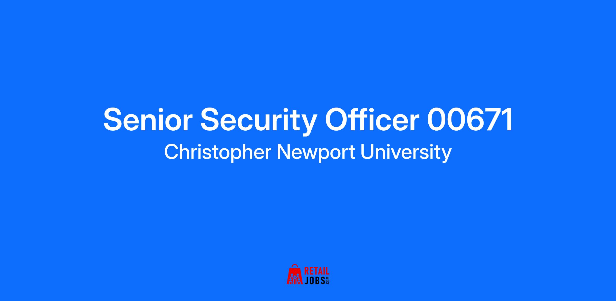 *Working Title:*Senior Security Officer 00671 *Role Title:*Security Officer III *Position Number:*00671 *FLSA:*Non Exempt *Appointment Type:*Full Time *Type of Posting:*General Public *Is Sensitive Position?:*Yes *If Sensitive Position, please paste statement:*This position is a sensitive position and requires that finalist applicants undergo a fingerprint-based criminal history check. *Designated Personnel:*Yes *Responsible Employee:*This position is designated as a “responsible employee” who has the authority to redress sexual violence, who has the duty to report incidents of sexual violence or other student misconduct, or who a student could reasonably believe has this authority or duty. *If Designated Personnel, please paste statement:*This position is a “designated position” meaning this position could potentially be required to work (depending on the event) during an emergency closing. *Statement of Economic Interest:*No *Is this a restricted position subject to availability of funding?:*No *Departmental Objective:*The University Police Department’s mission is to patrol the University properties helping to assure the safety and well-being of students, faculty, staff and visitors to the campus by using the philosophy of community policing. The Department’s mission will be achieved through a proactive, community service approach to problem resolution and by offering crime prevention programs on safety, self-protection, substance abuse, sexual assault, and protection of personal belongings. This mission will be the charge of every employee of this Department. The Security Section within the CNU Police Department is responsible for the safety and security of the faculty, staff, students, guests and the property of the Commonwealth of Virginia and Christopher Newport University. *Purpose of the Position:*The purpose of this position is to provide world class physical security services for designated locations and events, primarily the Mary M. Torggler Fine Arts Center, to protect the museum’s collection, life and property and to ensure a safe and secure business and educational environment so that arts and education programs can be accomplished by the operating staff, faculty, students, and visitors. *Knowledge, Skills, and Abilities Related to Position:* * Ability to flex to other departments on campus as business need dictates * Basic knowledge of general office practices, procedures and equipment * Must be dependable, and maintain a professional appearance * Excellent interpersonal communication and public contact skills * Excellent oral and written communication skills * Ability to communicate effectively with a wide variety of people in a variety of situations essential * Ability to work rotating shifts to include nights, weekends and holidays on an alternative work schedule * Ability to successfully pass a thorough background investigation to determine suitability to work with restricted law enforcement information * Ability to successfully complete the Department of Criminal Justice Services Campus Security Officer certification * Ability to work under pressure in response to emergency situations * Ability to establish and maintain cooperative working relationships with students, staff and the public * Ability to prioritize and handle multiple tasks simultaneously * Ability to independently evaluate critical situations and make decisions consistent with the mission and function of the CNU Police Department * Ability to maintain strict confidentiality *Education, Experience, Licensure, Certification Required :Education:* * High school graduate or equivalent education/experience that equates to a high school diploma * Valid driver’s license *Additional Consideration(s):Education:* * Associate’s degree or higher * Current certification as a Department of Criminal Justice Services Campus Security Officer. *Experience:* * Considerable experience working in a museum or fine arts security setting. * Experience in a security setting at an institution of higher education. * Prior experience using two-way radios and working with alarm systems. *Salary Information:*Starting at $36,552, Commensurate with Education and Experience *CNU Information:*This position includes Commonwealth of Virginia and Christopher Newport University employee benefits. CNU offers a comprehensive benefits package to include retirement plans, medical, dental, vision, and a variety of other options. Available leave includes vacation, sick time, personal time, and volunteer/service leave. State employees are eligible for discounted travel, banking, legal and retail services, among others. To view more information about our benefits, please visit [https://cnu.edu/hr/benefits/](https://cnu.edu/hr/benefits/). *Role Code:*69113 *Conditions of Employment:* * This is a classified position. New and returning classified employees are required to complete a 12-month probationary period * Selected candidate must attend a 2-day New Employee Orientation Program * *Ability to work rotating shifts to include nights, weekends and holidays on an alternative work schedule* * *Ability to successfully complete the Department of Criminal Justice Services Campus Security Officer certification* *Is this position telework eligible?:*No *Light Lifting (less than 20 lbs.):*Essential *Moderate Lifting (20-50 lbs.):*Marginal *Heavy Lifting (more than 50 lbs.):*Non-Applicable *Pushing/Pulling:*Essential *Standing:*Essential *Sitting:*Essential *Bending:*Essential *Walking:*Essential *Climbing:*Essential *Reaching:*Essential *Repetitive Motion:*Essential *Fast Pace:*Essential *Average Pace:*Essential *Multiple Priorities:*Essential *Intense Customer Interaction:*Essential *Multiple Stimuli:*Essential *Frequency Changes:*Essential *Memory:*Essential *Reasoning:*Essential *Hearing:*Essential *Reading:*Essential *Analyzing:*Essential *Logic:*Essential *Verbal Communication:*Essential *Written Communication:*Essential *Posting Numbe