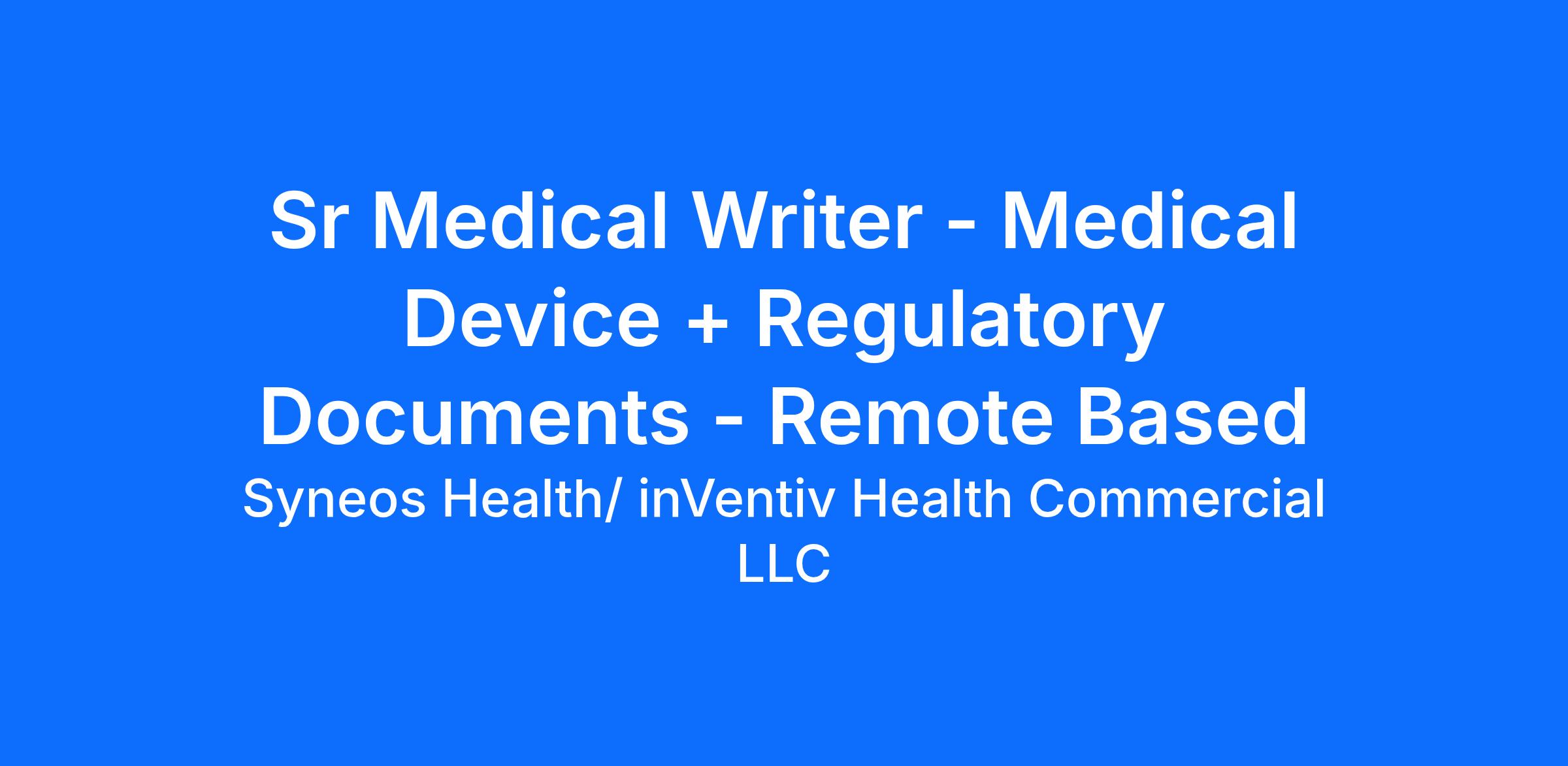 Sr Medical Writer - Medical Device + Regulatory Documents - Remote BasedSyneos Health is a leading fully integrated biopharmaceutical solutions organization built to accelerate customer success. We translate unique clinical, medical affairs and commercial insights into outcomes to address modern market realities. Our Clinical Development model brings the customer and the patient to the center of everything that we do. We are continuously looking for ways to simplify and streamline our work to not only make Syneos Health easier to work with, but to make us easier to work for.Whether you join us in a Functional Service Provider partnership or a Full-Service environment, you'll collaborate with passionate problem solvers, innovating as a team to help our customers achieve their goals. We are agile and driven to accelerate the delivery of therapies, because we are passionate to change lives.Discover what our 29,000 employees, across 110 countries already know:WORK HERE MATTERS EVERYWHEREWhy Syneos Health