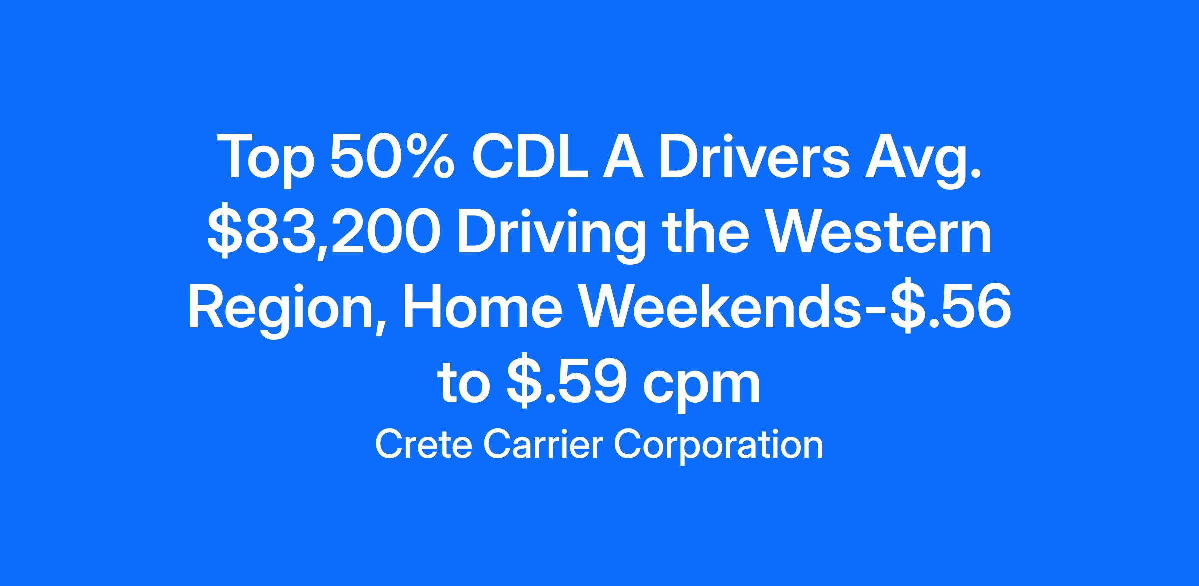 Crete Carrier offers home weekends with the Western Region fleet.Salary: Top 50% average $83,200 per yearCPM: Starting pay $.56 to $.59 cpmExperience: One-year verifiable tractor trailer experience with a class A CDL