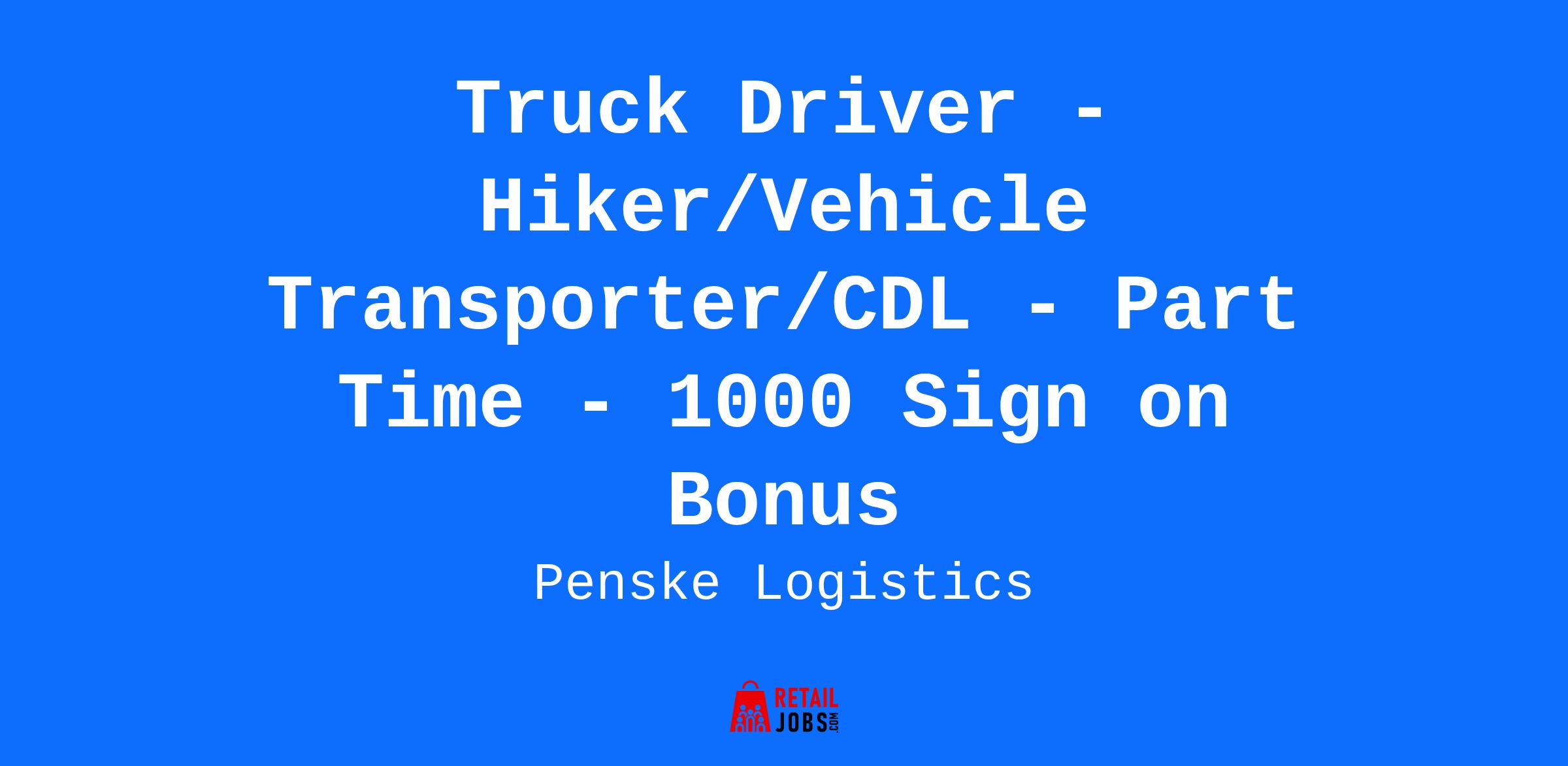 Truck Driver - Hiker/Vehicle Transporter/CDL - Part Time 1000 Sign on Bonus Position Summary: Penske Truck Leasing seeks highly motivated and qualified applicants to fill the unique position of Hiker (Vehicle Transporter/Truck Driver). This position is responsible for vehicle delivery and returning vehicles to Penske locations and Penske customers. Primarily, this position moves our box trucks up to 26 and for CDL Class A will include tractors and trailer movement. Position may also provide assistance to the service department to deliver parts and equipment. This is a casual/on-call part-time truck driving job that is perfect for licensed CDL Class B or CDL Class A drivers seeking supplemental income and looking to work anywhere from 0 to 25 hours a week based on business needs. This position will be located at the Penske facility located at 436 Riverside Avenue in Medford, MA. Major Responsibilities: Follow appropriate safety procedures while driving trucks to destination of Penske location or customer locations Check vehicles to ensure that mechanical, safety, and emergency equipment is in good working order, report to location manager if any issues are found Obtain receipts or signatures for delivered goods and collect payment for services when required Report vehicle defects, accidents, traffic violations, or damage to the vehicles Other projects and tasks as assigned by supervisor Qualifications: 2 years of driving experience required 2 years of a clean DMV motor vehicle record required CDL Class B license required CDL Class A license preferred Ability to read and follow written instructions is required. Ability to work independently, customer service skills, organizational skills, and a positive attitude are required Regular, predictable, full attendance is an essential function of the job As this position requires driving Penske and customer vehicles, it is regulated by the DOT and requires a current driver qualification file to be maintained as required by the role. The driver qualification file includes: an annual motor vehicle records (MVR) check, a successfully completed DOT Physical, and Safety Performance History records request from prior employers in the last 3 years. Additionally, CDL holders will have a DOT Drug Screening within 30 days of start and subject to a FMCSA Clearinghouse review. Willingness to travel as necessary, work the required schedule, work at the specific location required, complete Penske employment application, submit to a background investigation (to include past employment, education, and criminal history) and drug screening are required. This position is regulated by the Department of Transportation or designated as safety sensitive by the company, and the ability to work in a constant state of alertness and in a safe manner is required. Associates must have the ability to accept responsibility for their own safety, as well as the safety of others. Physical Requirements: The physical and mental demands described here are representative of those that must be met by an associate to successfully perform the essential functions of this job. Reasonable accommodations may be made to enable individuals with disabilities to perform the essential functions. The associate must be able to see and hear. Specific vision abilities required by this job include close vision, distance vision, peripheral vision, depth perception and the ability to adjust focus. While performing the duties of this job, the associate will be required to move frequently, stand, walk, and sit. The associate is frequently required to use hands to touch, handle, and feel, and to reach with hands and arms. The associate must be able to regularly lift and/or move up to 50lbs/23kg and occasionally lift and/or move up to 100lbs/45kg. The associate must be able to legally operate a motor vehicle and safely and frequently enter/exit the vehicle as well as the rear cargo area. Penske is an Equal Opportunity Employer. About Us About Penske Truck Leasing/Transportation Solutions Penske Truck Leasing/Transportation Solutions is a premier global transportation provider that delivers essential and innovative transportation, logistics and technology services to help companies and people move forward. With headquarters in Reading, PA, Penske and its associates are driven by a dedication to excellence and a commitment to customer success. Visit Go Penske to learn more.